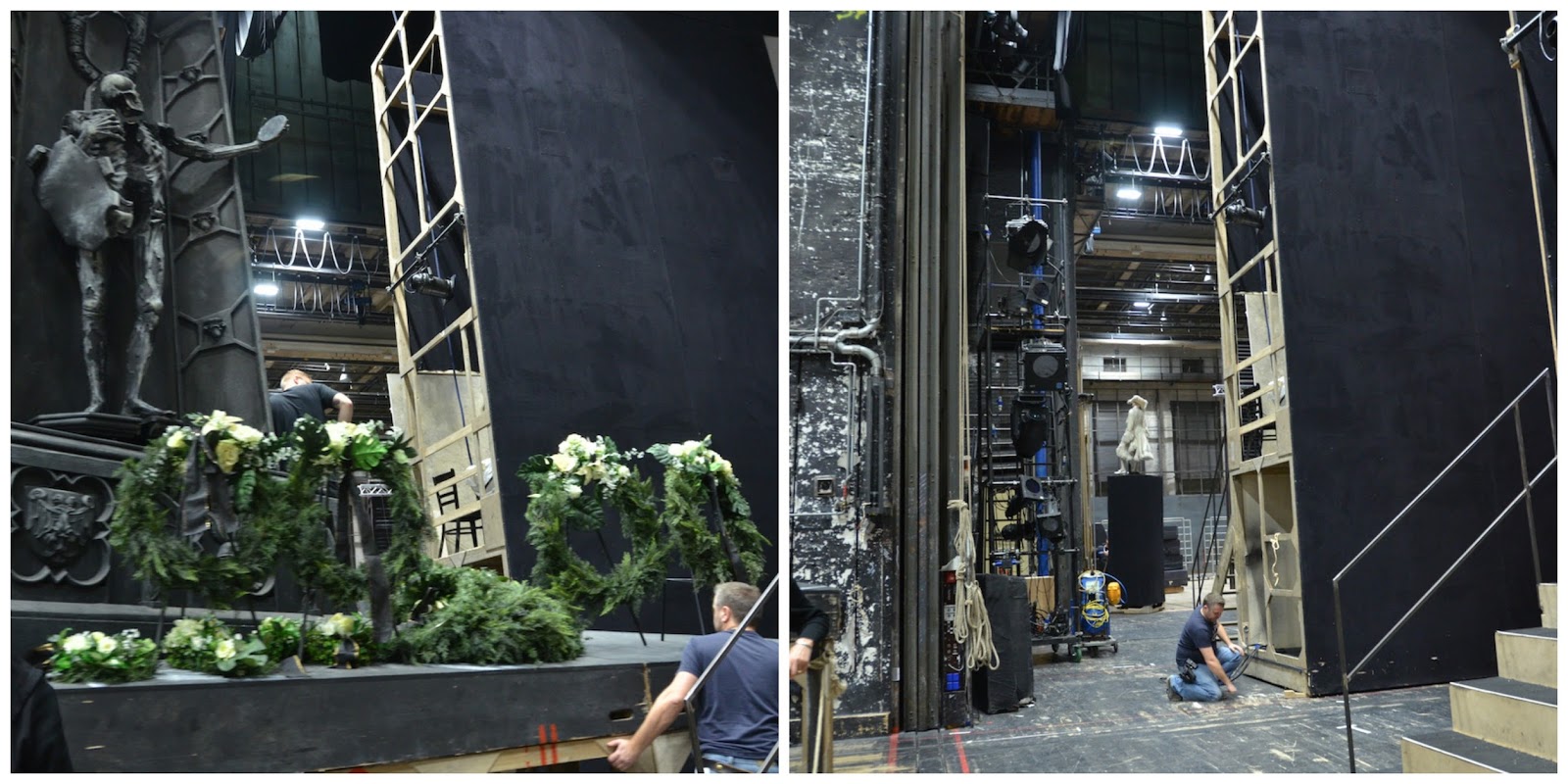 Tenemos la suerte de poder llegar hasta el escenario donde vemos cómo se realizan los trabajos de montaje de toda la escenografía y decorados para la representación de esa noche de la ópera Don Giovanni.