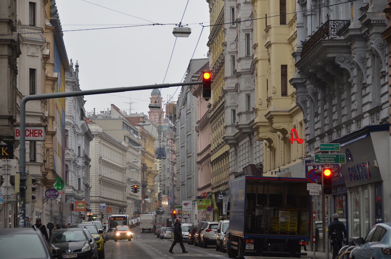Volvimos al metro y nos bajamos en la parada de Karlsplatz, estaba comenzando otra vez a nevar suavemente y hacía un frío intenso!! Nos fuimos hacia la calle Gumperdorfer, una calle que está tomando protagonismo por sus locales de ocio y restaurantes.