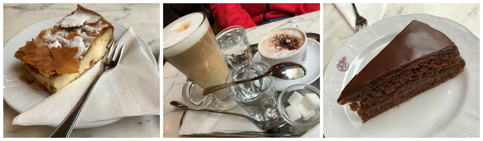 Aprovechamos para calentarnos y pasamos al tomar algo al Café Sperl, otro de esos cafés famosos de la ciudad. Junto con un capuchino y un café latte (que estaba buenísimo por cierto), probamos dos porciones de tarta, una de la típica Sacher y otra de cheescake de manzana.