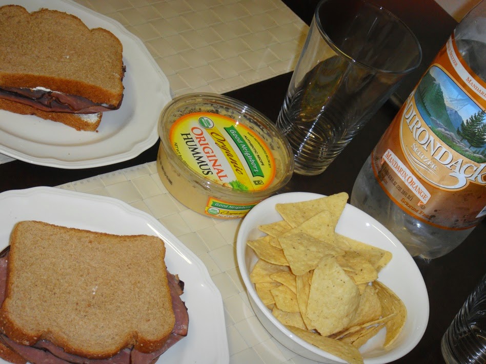 Tras un rato de gimnasio nos hemos ido a casa. Hoy para cenar ha tocado un sándwich que crema de queso y roast beef y unos nachos con hummus, con mi agua con gas sabor mandarina que me encanta!!!