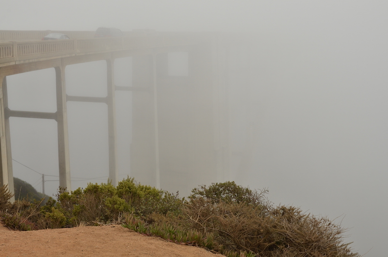 Continuamos nuestra ruta por el fantástico Big Sur, la niebla era bastante intensa y en ocasiones aunque nos asomásemos a los acantilados, no se veía prácticamente nada, de hecho el famoso puente Bixby, construido en 1932, no pudimos verlo, aunque entre la espesura de la niebla, podíamos intuir donde se encontraba.