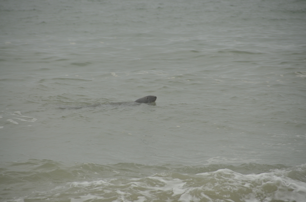 Allí hemos estado un rato disfrutando del paisaje y viendo como pasaban las focas muy cerca de la orilla, en realidad avisan de que los tiburones lo que quieren es comer focas, pero si te encuentran en su camino yo creo que tampoco hacen ascos…. La playa con la niebla tenía un encanto especial, pocos eran los valientes que se atrevían a meterse al agua y no sólo por el aviso de los escualos, si no por que está fría de verdad.