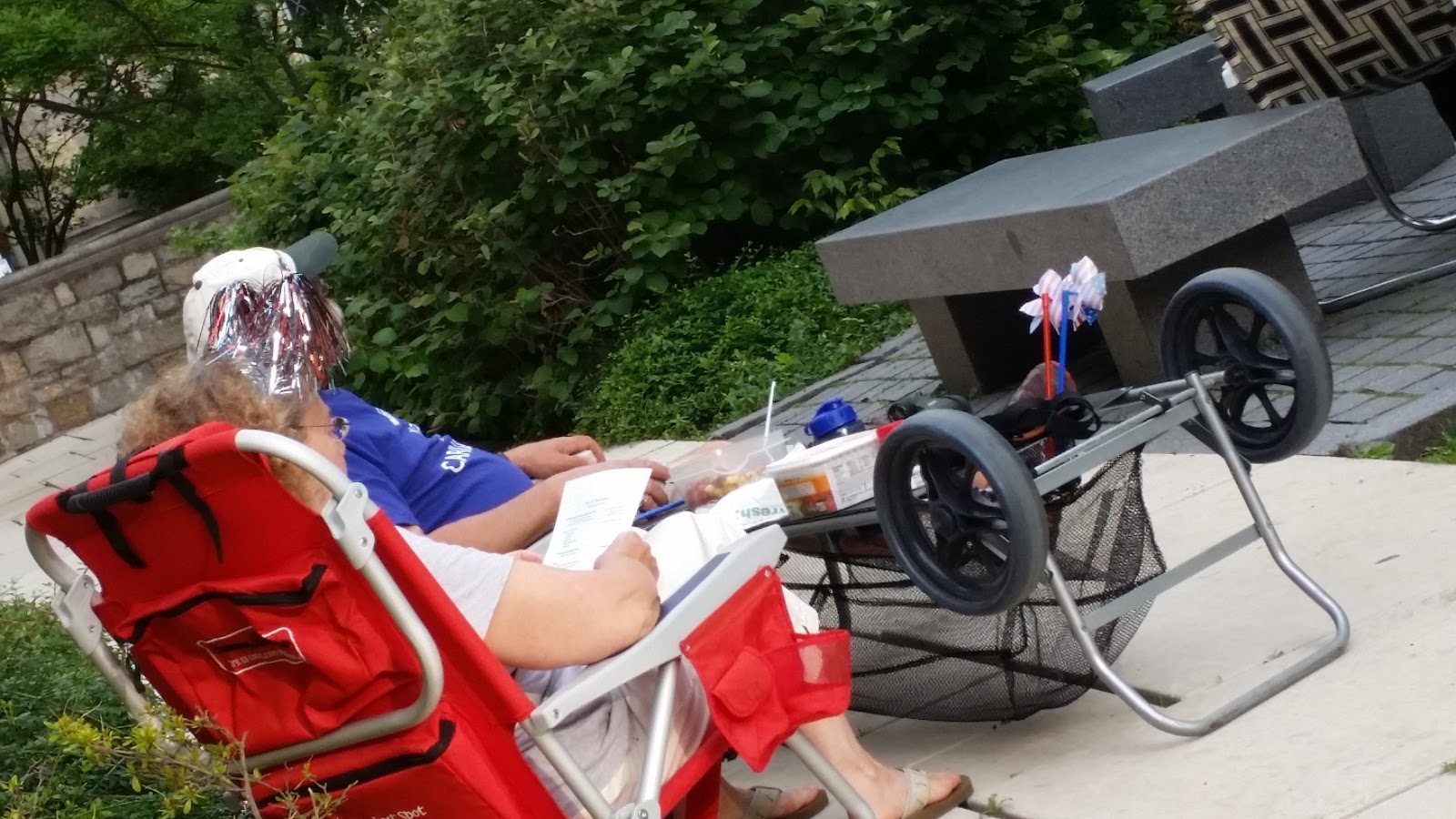 Algunos se lo montan más que bien, con carro-mesa, su cena y decoración con los colores de la bandera, incluido diadema para la señora, jejeje.