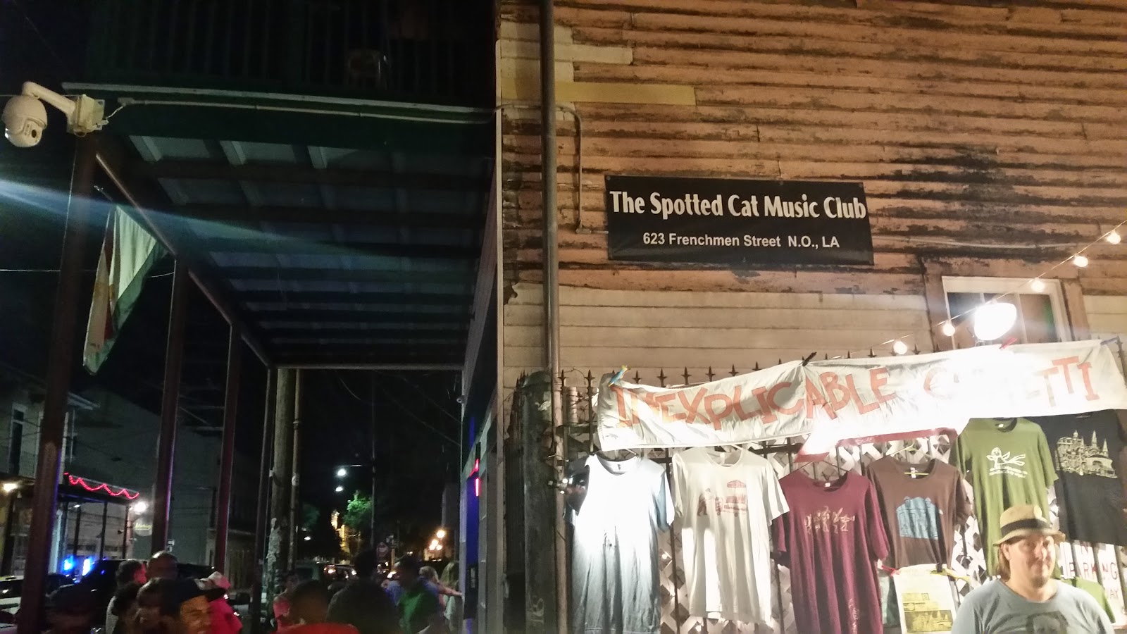 De allí nos fuimos a otra zona famosa de la ciudad, Frenchmen St, una zona muy animada con bares con música en directo y un mercadillo de artesanía con mucho encanto. Uno de los pubs más conocidos es el Spotted Cat, con música en directo y mucha, mucha gente, vamos que hemos pasado y nos hemos tenido que salir porque era insoportable estar allí, no sé si será que me estoy haciendo mayor, pero estar de pie, con gente pegada por todos lados, música alta y no poder hablar, no es que sea de las cosas que más me apetezcan, la verdad. Así que damos una vuelta por el mercadillo, vemos el ambiente general de la zona y nos cogemos un taxi de vuelta al hotel pues Diego aún tiene que madrugar para el último día de la conferencia.