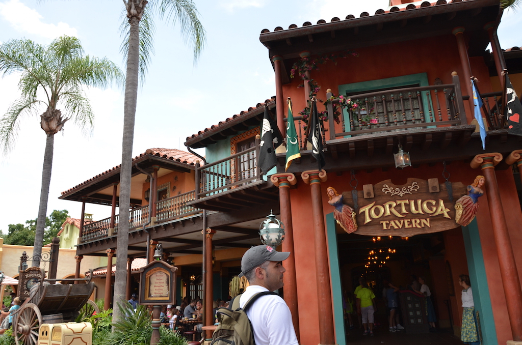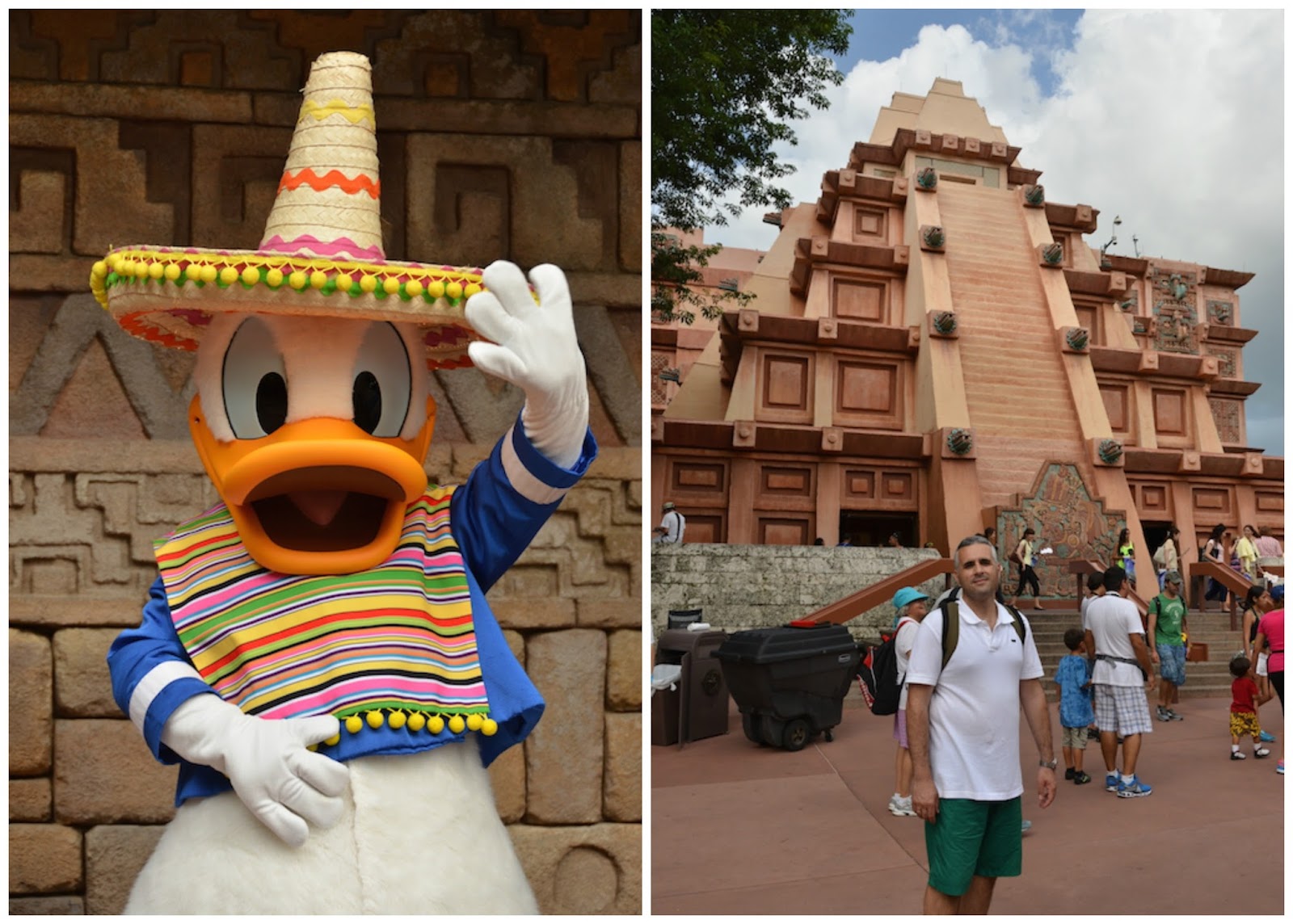Viniendo de la atracción del simulador aeroespacial (señalado en el plano con el número 3), nosotros empezamos la visita por México, donde nos recibió un gracioso pato Donald mimetizado con la cultura mexicana, además podemos encontrar mariachis, vendedores de sombreros y hasta una pirámide maya.