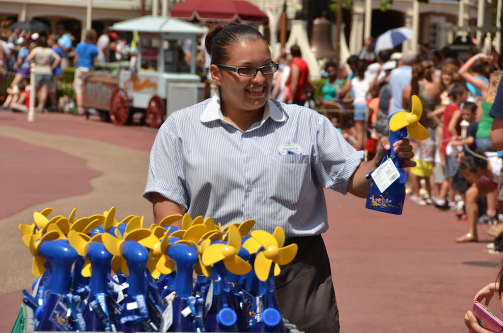 Antes de que empiece el desfile, vendedores del parque pasan entre la gente ofreciendo diferentes productos, globos, spray de agua con ventilador, etc., es impresionante el marketing del que disponen.