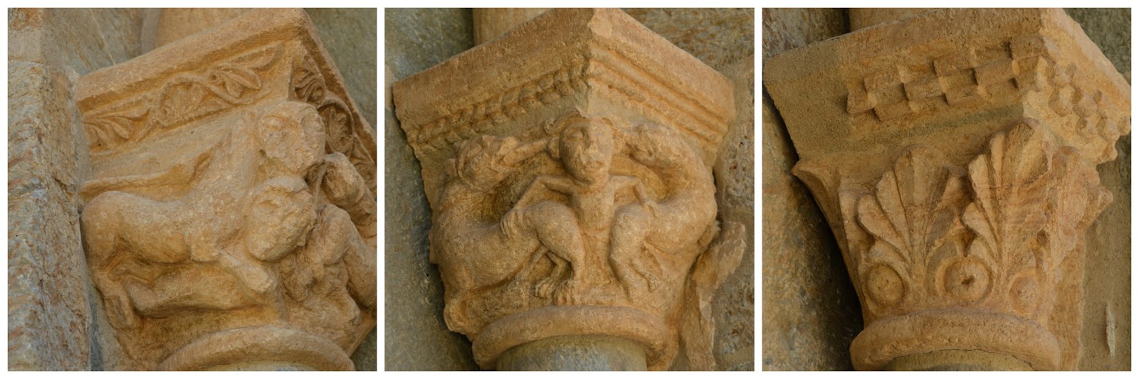 En la portada posee una decoración también diferente al resto, destacando el Crismón y unos capiteles decorados sobre las columnas de la puerta de acceso.