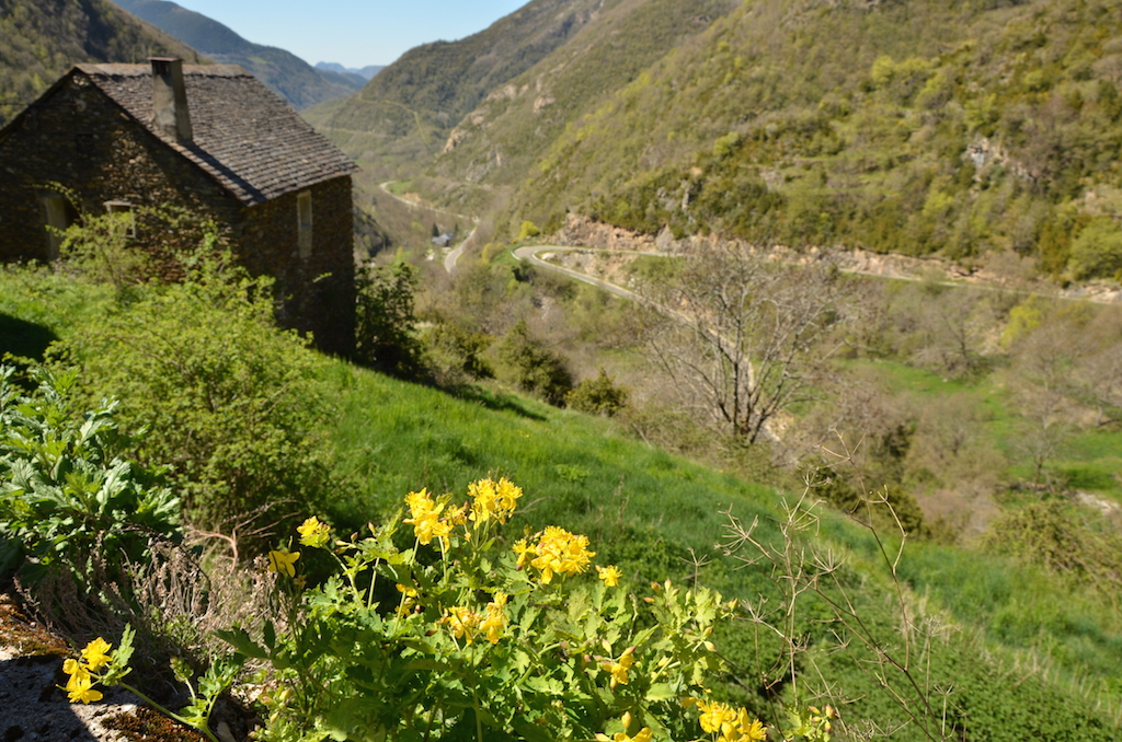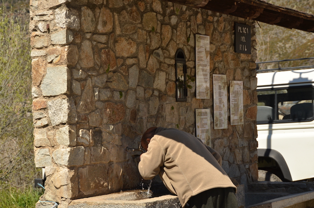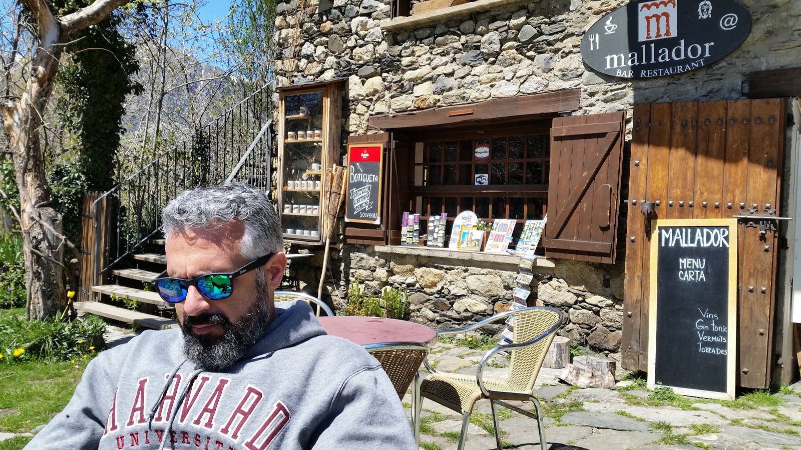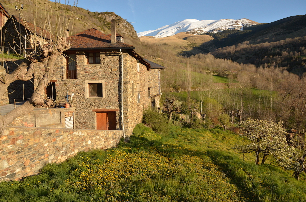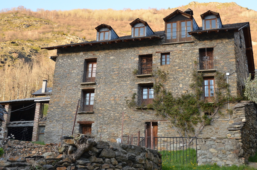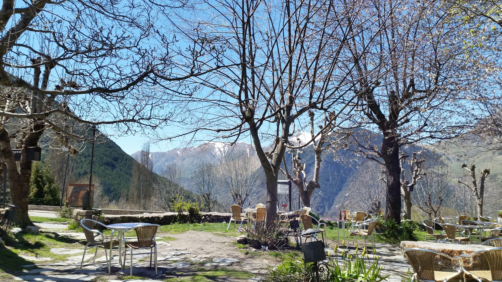 Ya en el exterior, volvemos a descender hasta la Iglesia de Sant Climent, ya que habíamos visto un lugar donde queríamos comer. Se trata del restaurante Mallador, donde su propietario David, nos atendió de maravilla y nos preparó unos platos exquisitos de comida típica de la zona, tanto que volveríamos al día siguiente a cenar…. Además de restaurante, es una casa rural donde también puedes alojarte, desde luego que las vistas y el trato no pueden ser mejores, así que lo recomiendo totalmente. La casa rural se llama Ca de Corral, y allí estaba alojada Chihiro, una japonesa que conocimos en el propio restaurante y que había venido desde Tokio a pasar una semana a Taüll, había visto en algún sitio una foto del lugar y le encantó, así que no dudó en coger un vuelo a Barcelona, un autobús y presentarse allí para disfrutar del entorno. Compartimos con ella algunos ratos (ese mismo día de la comida y posteriores) y fueron muy agradables, hablamos de nuestra  visita a su país el próximo verano y nos dio algunos consejos, la verdad es que me encanta conocer gente de todas las partes del mundo con las que poder hablar de viajes, y es que David, el propietario del Mallador, es todo un viajero que ha recorrido gran parte del mundo.