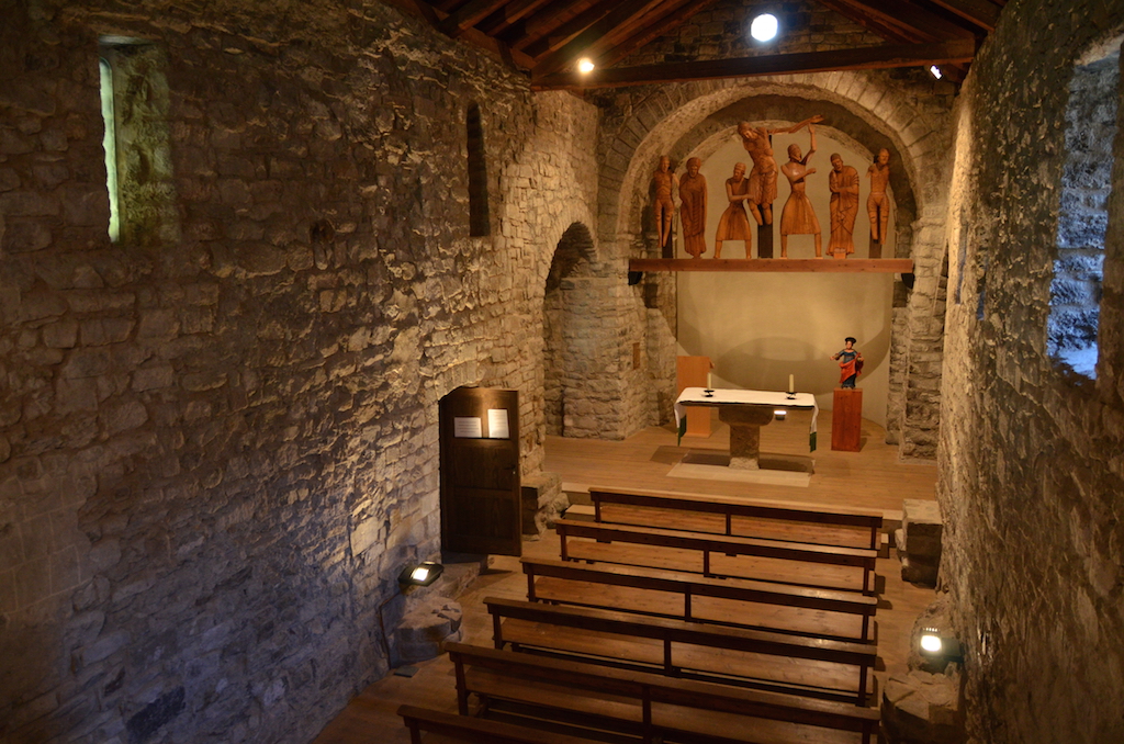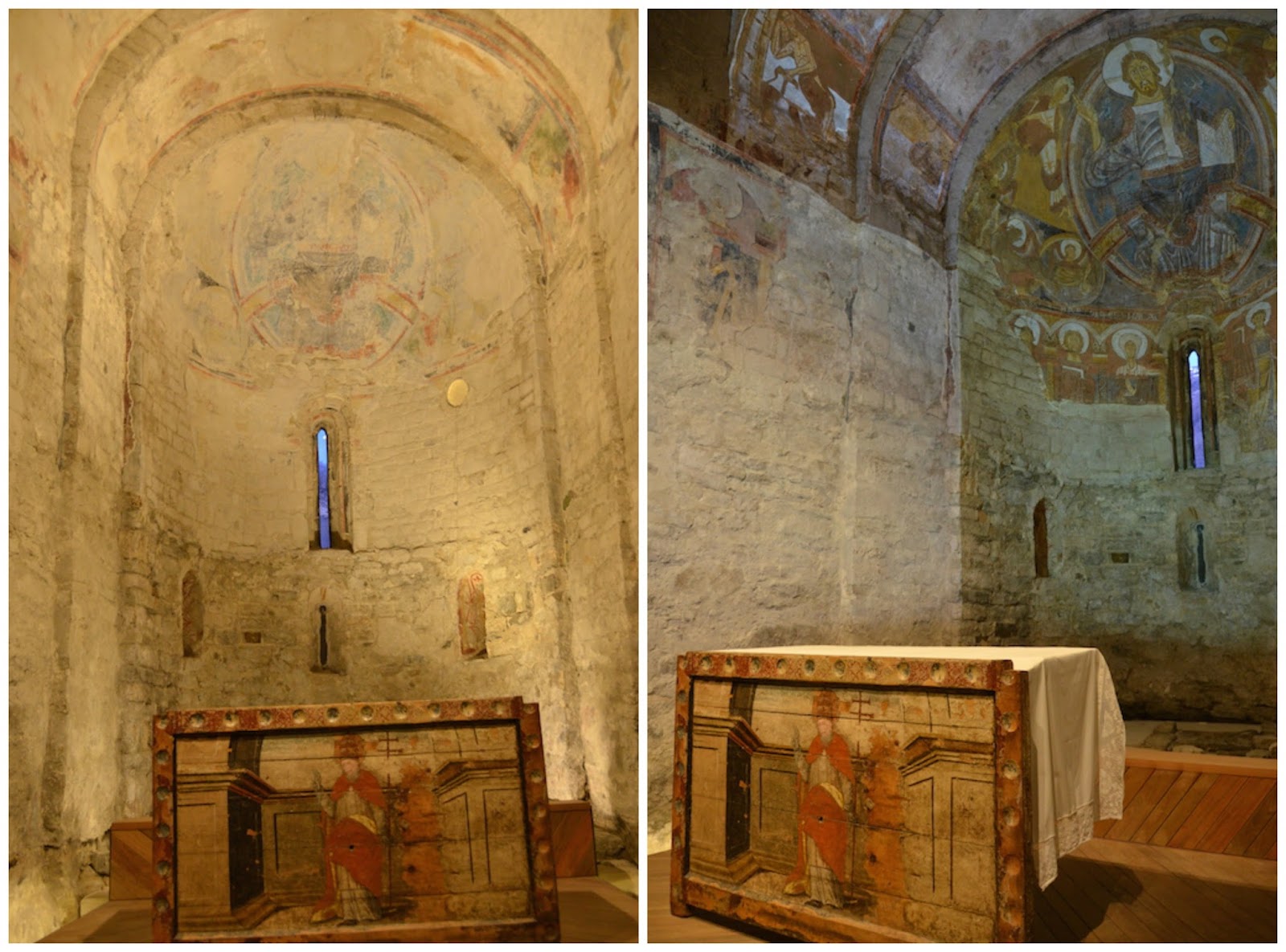 Merece la pena darse la vuelta por un sendero para ver el ábside, el cual está decorado con los distintos motivos románicos de influencia lombarda que se vienen repitiendo en todo el conjunto, tales como los arquillos ciegos, las lesenas verticales y el friso en dientes de sierra.