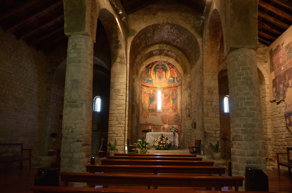 Si el exterior de la Iglesia es bonito, su interior es simplemente espectacular. Aún se conservan algunos restos de pinturas románicas originales, pero la pintura que destaca es la que encontramos en el ábside central, El Cristo en Majestad, El Pantocrator. El que podemos observar ahora es una reproducción, ya que el original fue arrancado y trasladado al Museo Nacional de Arte de Cataluña para su conservación, pero aún así no deja de sorprender a todo el que lo visita, de hecho, observé como alguna persona preguntaba si era original por lo bien que estaba, y la verdad es que sí.