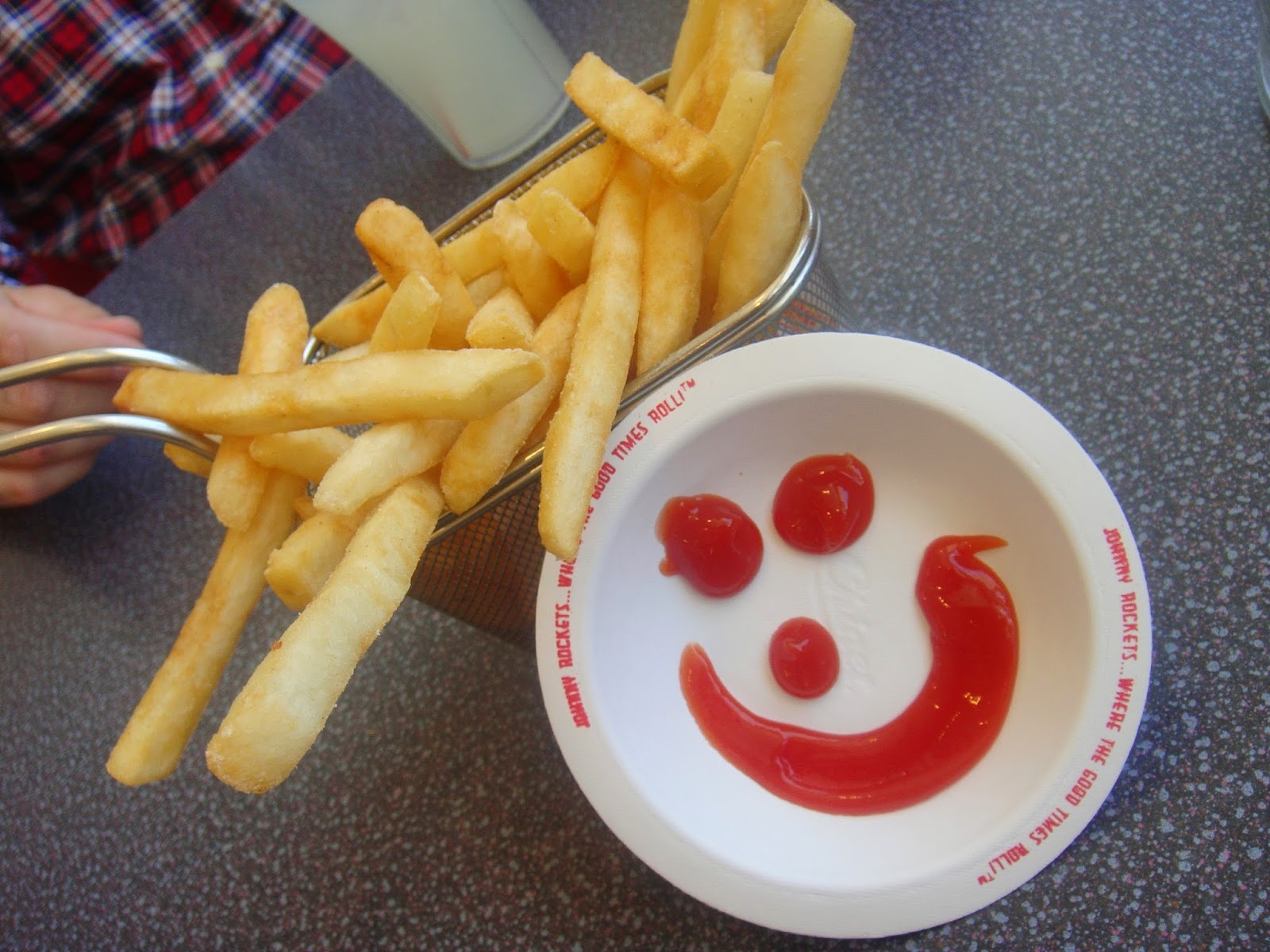 Comemos cerca del campus de la universidad en un lugar que se llama Johnny rockets, una franquicia de hamburguesas bastante aceptable con una atmósfera de los años cincuenta.