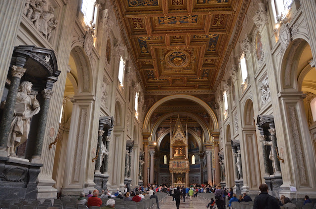 El interior se divide en cinco naves como he comentado anteriormente, es un interior majestuoso, digno de un lugar donde hasta 1870 se coronaba a los papas. Francesco Borromini fue el encargado de una restauración encargada por el papa Inocencio X en 1646, el artista creó 12 nichos a ambos lados de la nave central donde hoy podemos ver las estatuas barrocas de los apóstoles.