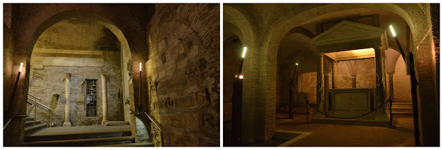 A través de una escalera se desciende a lo que se ha descubierto con las excavaciones, a los otros niveles de la basílica, pudiendo disfrutar de obras de arte con mucha historia que han permanecido enterrados durante muchos años. Frescos que representan milagros, otros que representan reliquias, el Descenso a los Infiernos, e incluso una Virgen con el niño que se conserva en muy buen estado.
