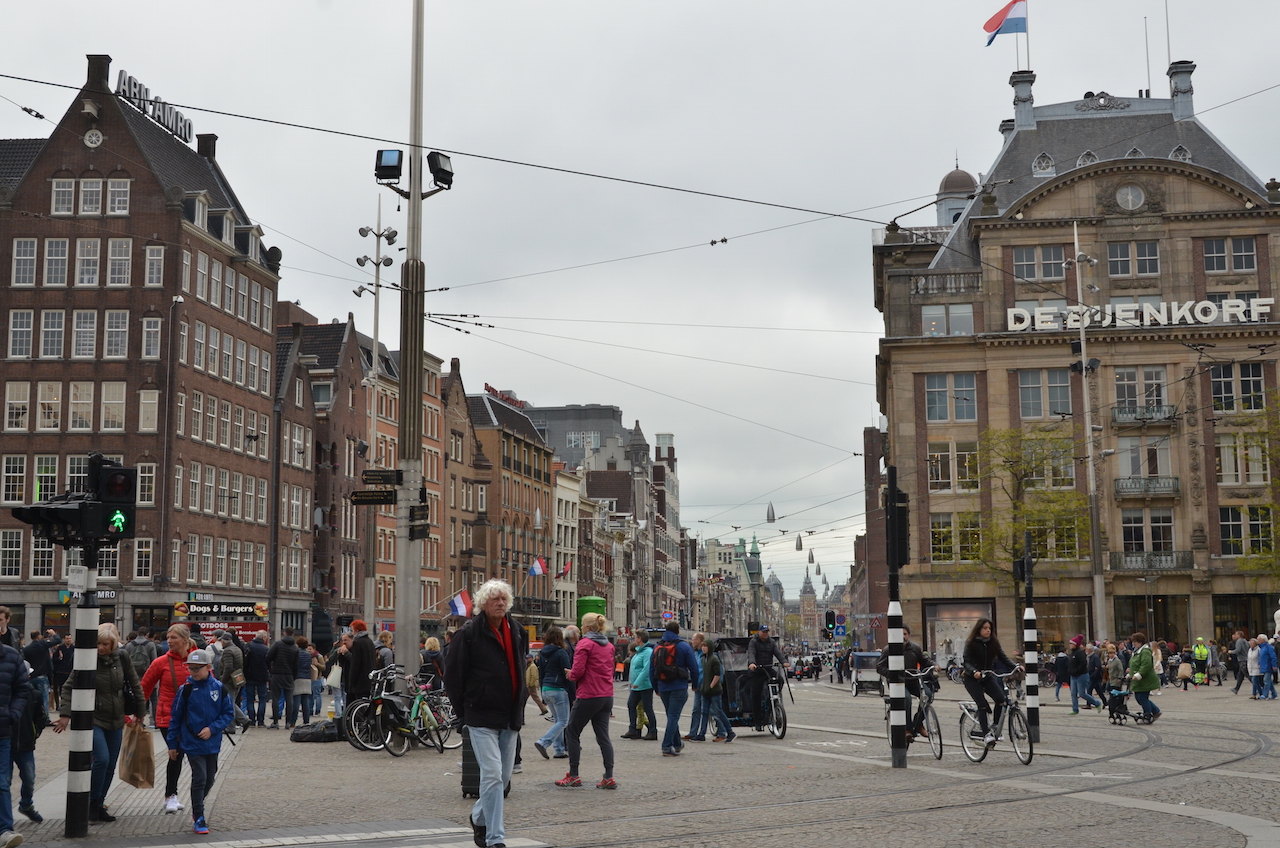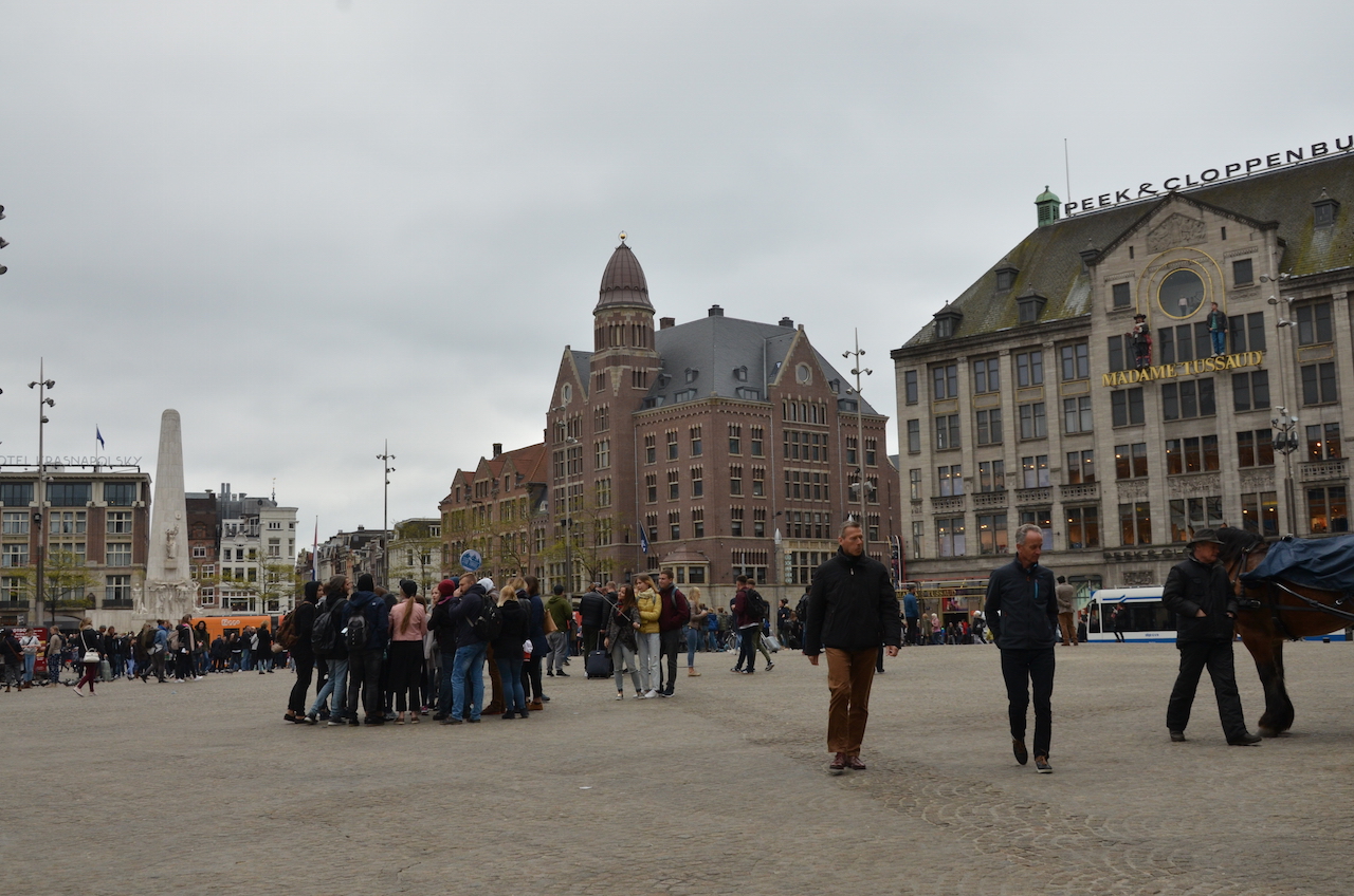 Llegamos a la Plaza Dam, el lugar en el que se fundó la ciudad y que hoy es uno de los puntos de encuentro preferidos de los lugareños. En ella se pueden encontrar varios edificios importantes como el Palacio Real, la Bolsa, la Iglesia Nieuwe Kerk, el Museo Madame Tussauds y varias tiendas.