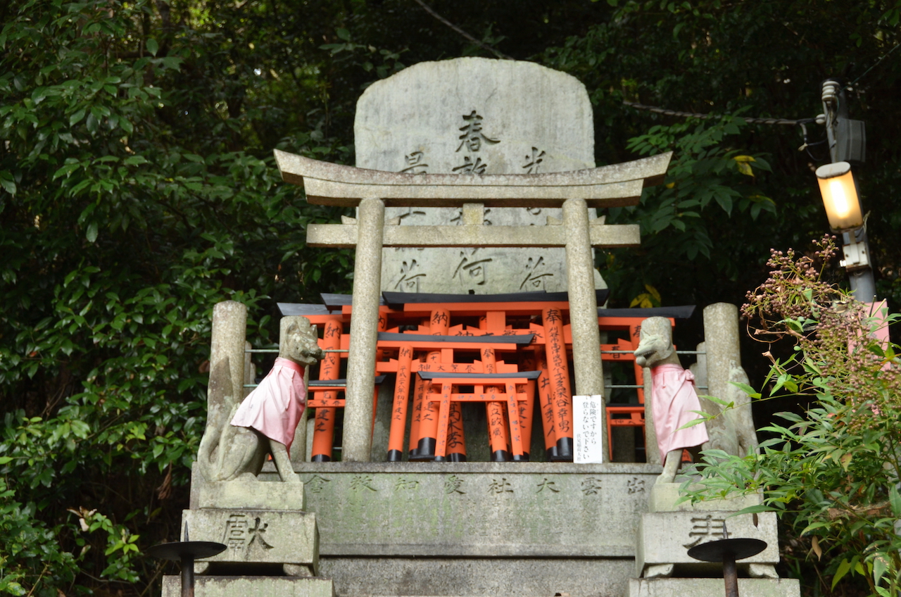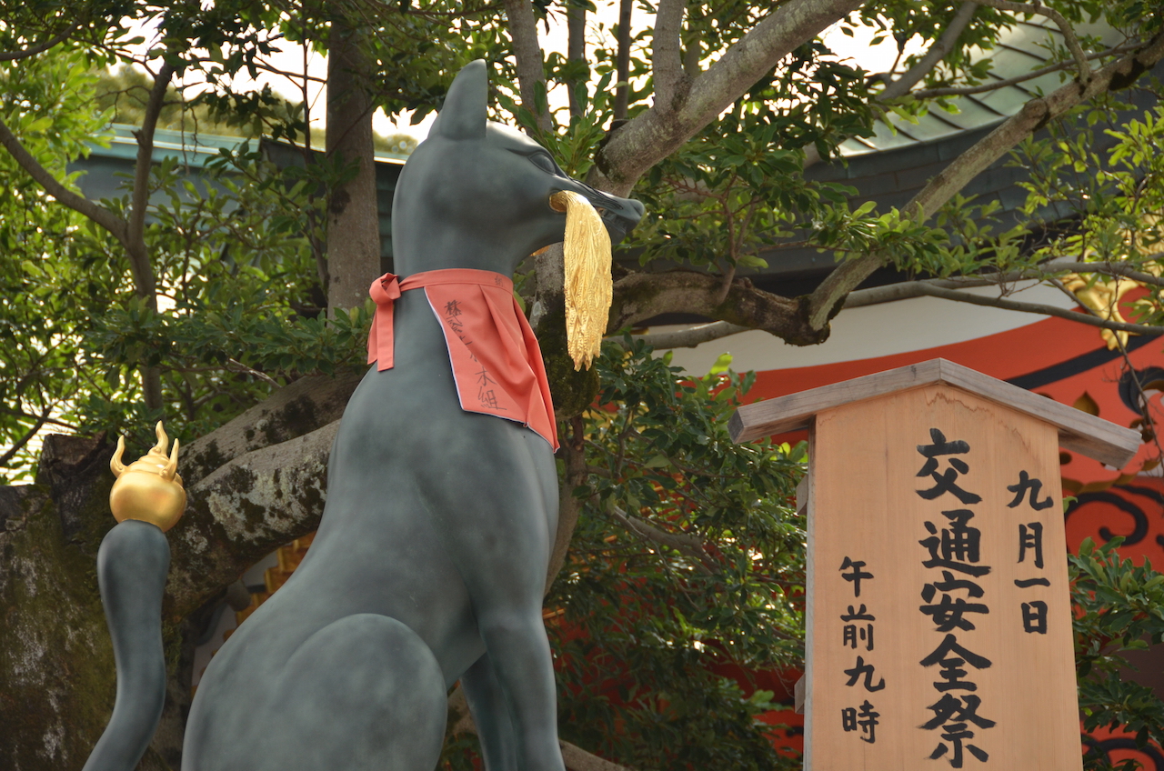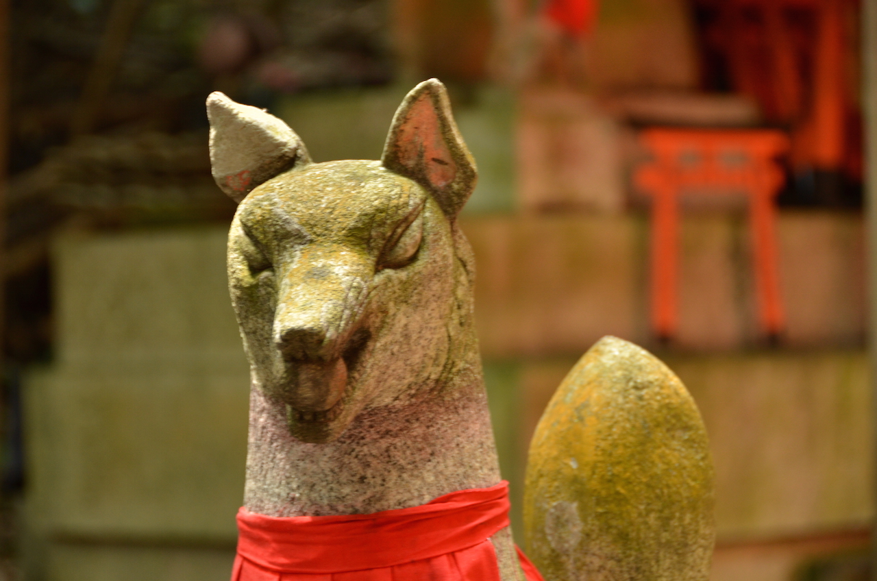 Por todo el complejo del templo podemos ver la imagen del zorro o kitsune, ya que es considerado como el mensajero del dios Inari. En la boca lleva una llave, la que abre y cierra el lugar donde se guarda la cosecha de arroz, símbolo de la riqueza.