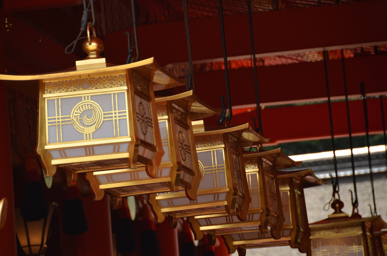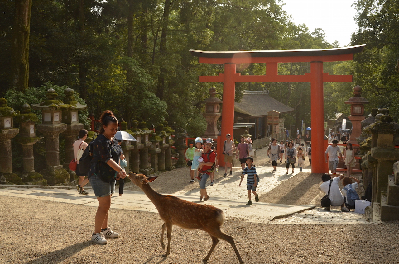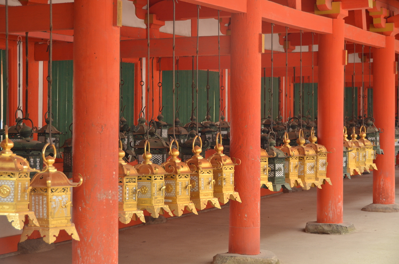 El Torii rojo marca la entrada al santuario sintoísta más famoso de la ciudad, el Kasuga Taisha, famoso por sus miles de farolillos, no sólo en los senderos de alrededor del mismo, si no en el interior del propio santuario. En los caminos que llevan hasta allí se pueden ver más de 2000 farolillos de piedra.