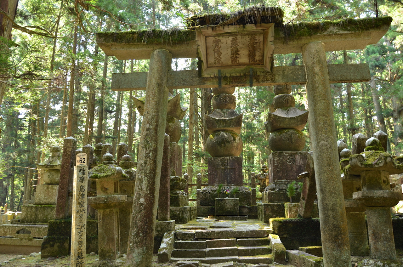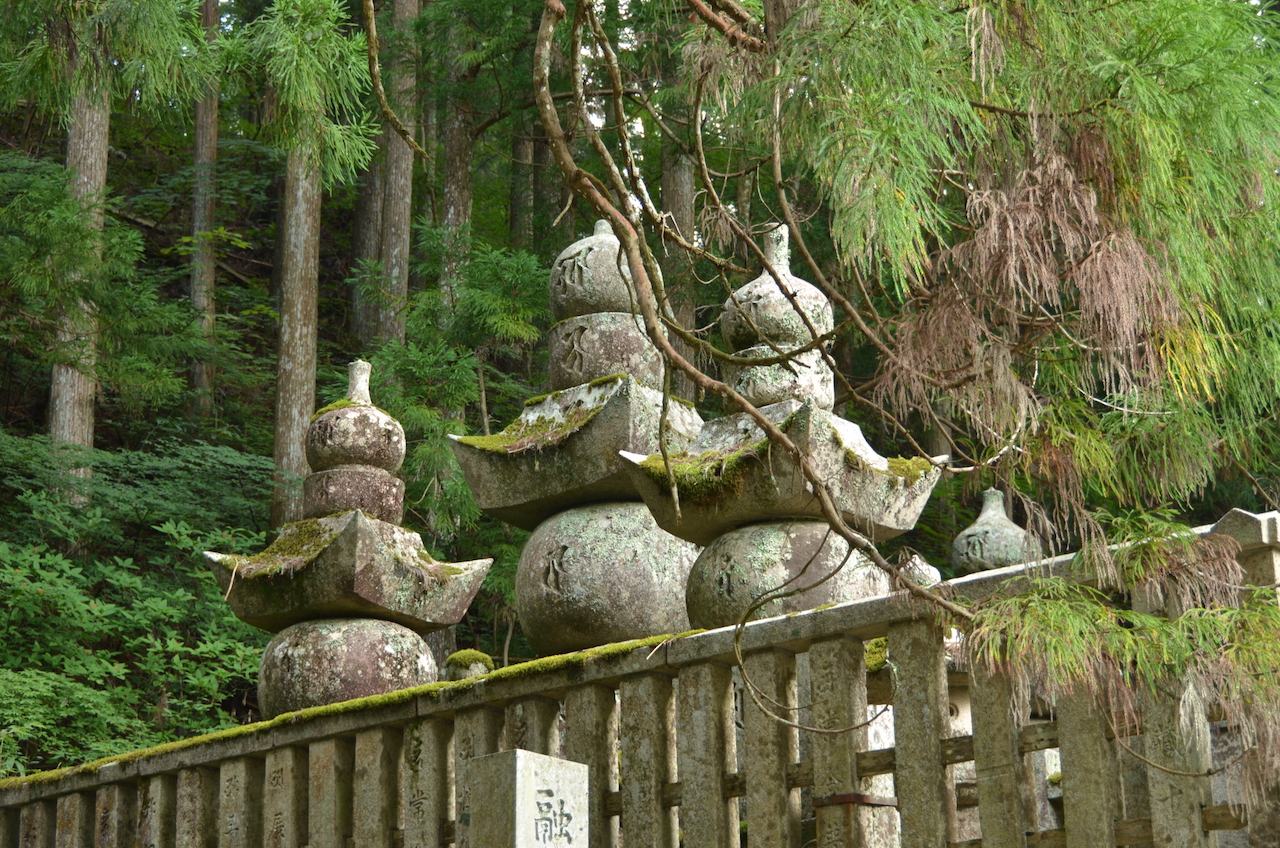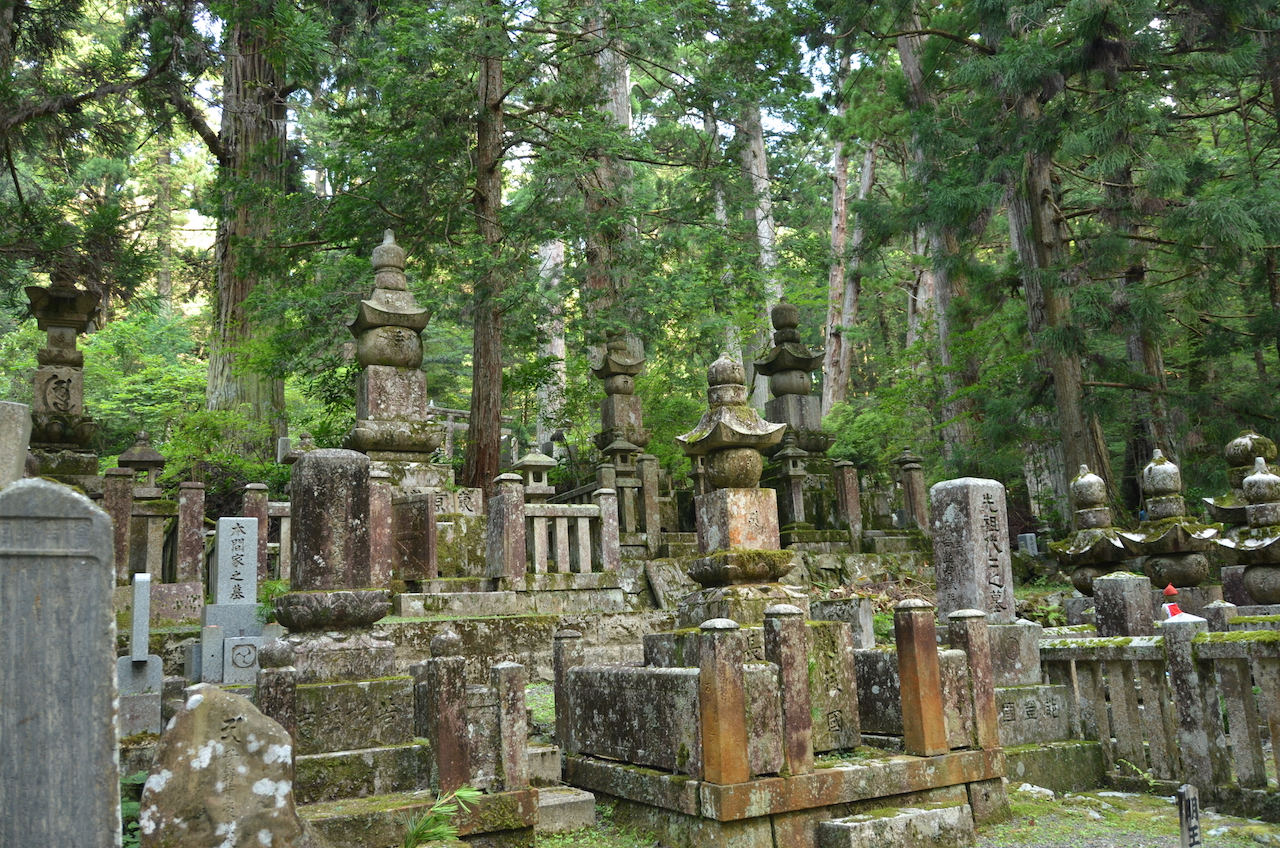 Hasta el mausoleo de Kobo-Daishi, el monje Kukai, hay aproximadamente unos dos kilómetros a lo largo de los cuales se pueden ver miles de estupas, estatuas jizos, todo el conjunto en un ambiente muy especial. Sólo las familias pudientes pueden ser enterrados allí.