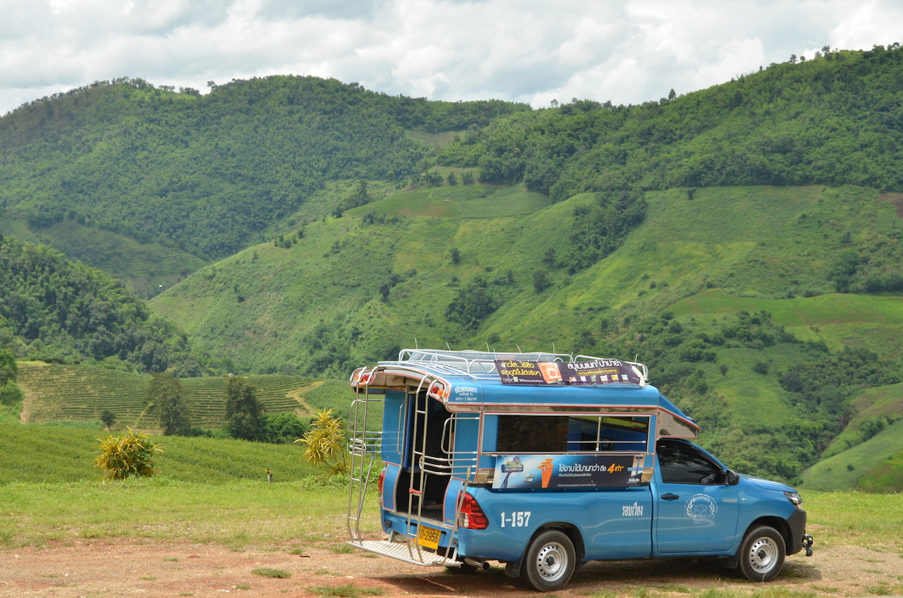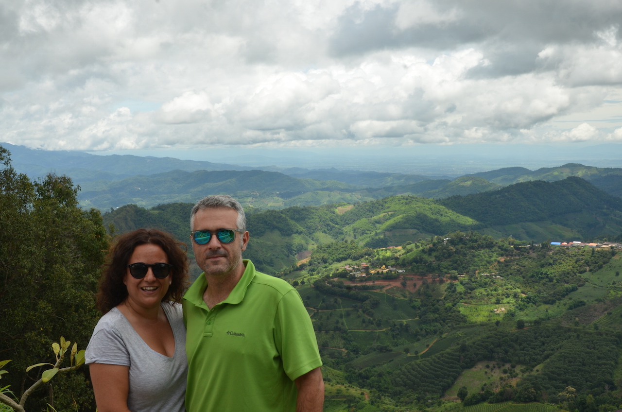 Mae Salong se encuentra aproximadamente a unos 70 kilómetros de Chiang Rai, pero hay que tener en cuenta que la carretera para llegar allí es una carretera de montaña, bastante sinuosa y en ocasiones con fuerte pendiente. Mientras íbamos sentados atrás disfrutando del paisaje nos alegramos muchísimo de no haber alquilado una moto para hacer ese trayecto, los hubiésemos pasado mal y además a ratos caía un chaparrón importante!!