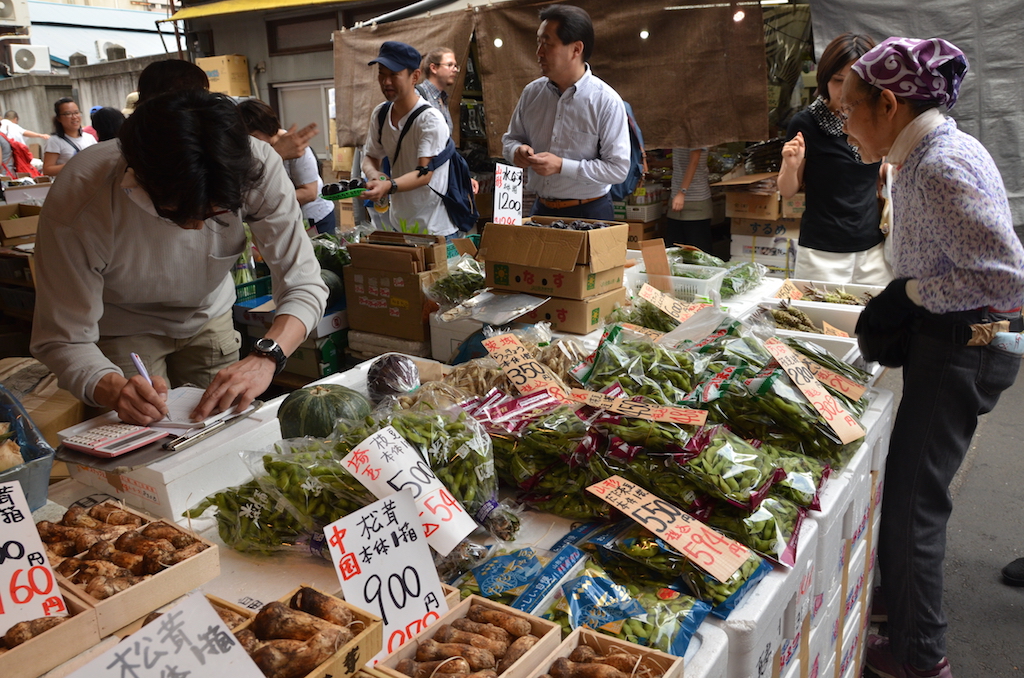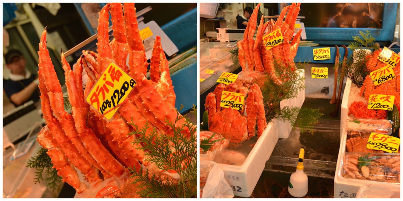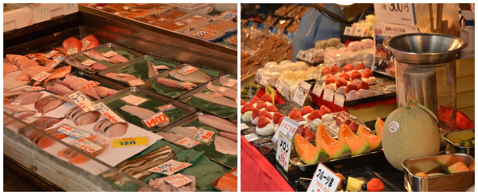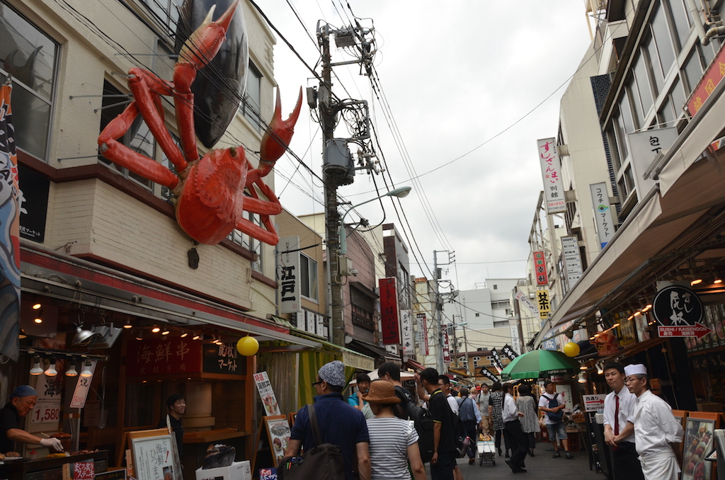 Después de esta visita, llegamos a la zona exterior del mercado Tsukiji. Este mercado se divide principalmente en dos zonas, la interior, donde tiene lugar la tradicional subasta del atún y venta de otros pescados, y la exterior, con multitud de puestos en los que venden casi de todo, y por supuesto, mucho pescado también.