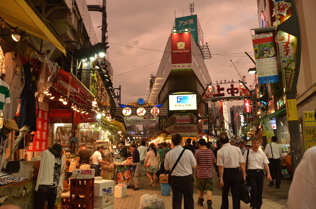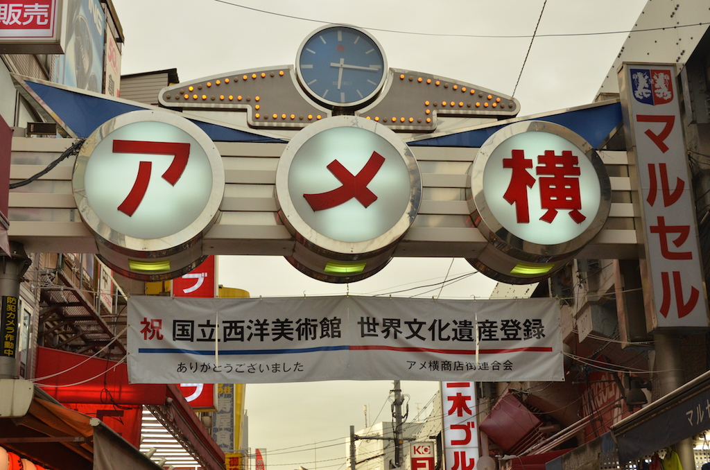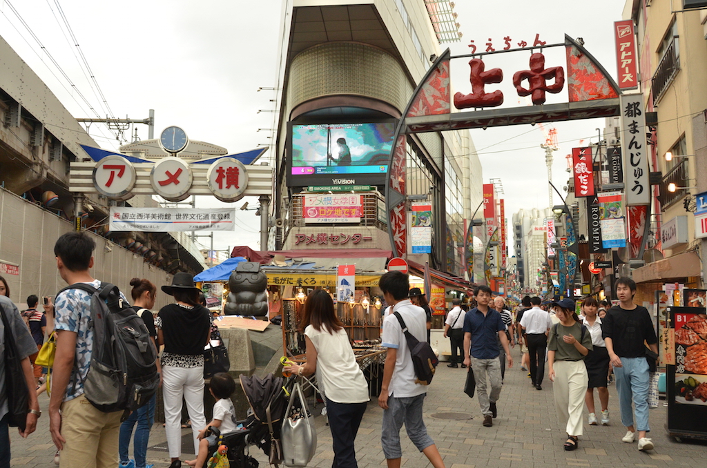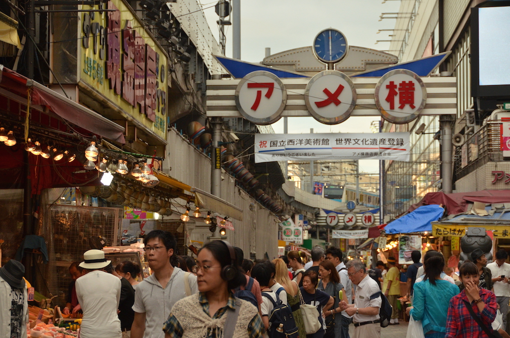 El siguiente lugar que visitamos nos encantó, se trata del famoso mercado Ameyoko, un conjunto de calles que forman un gran mercado al aire libre lleno de tiendas de todo tipo. Hay quien dice que «Ame» viene de América, y es que después de la Segunda Guerra Mundial, aquí se podían encontrar productos americanos procedentes del mercado negro.