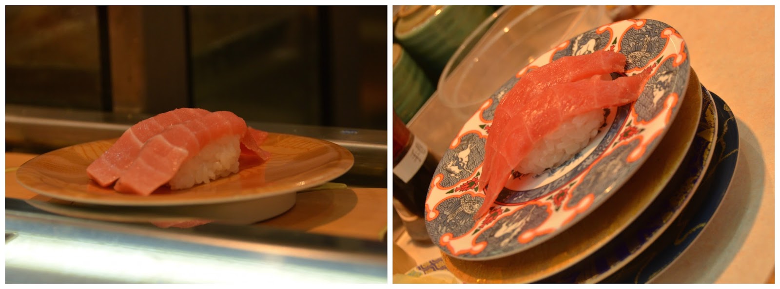 La camarera muy amable nos explicó un poco el funcionamiento y enseguida comenzamos a coger nuestros platos, madre mía que rico estaba!!!! Probamos diferentes tipos de atún dependiendo de la grasa que contenía y que también variaba su precio, cuanto más graso, más caro. A nosotros el que más gustó fue el intermedio, del que repetimos varias veces, jejeje, eran sólo las 11 de la mañana y nosotros nos estábamos poniendo tibios de sushi.