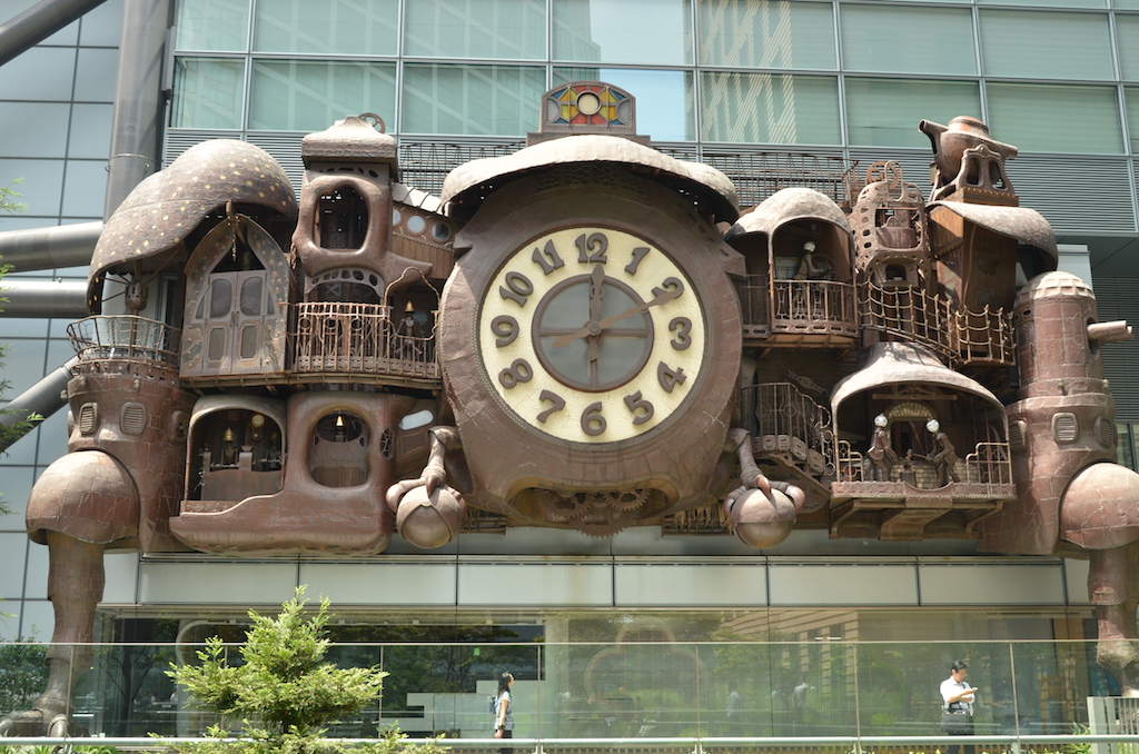 Dejamos el mercado y nos vamos dando un paseo hasta la zona de Shimbashi donde se encuentra el edificio de la televisión japonesa, el Nipon TV Building. El interés por llegar hasta aquí es para ver lo que se encuentra en los bajos de este edificio, se trata del reloj diseñado por Hayao Miyazaki, de los estudios Ghibli.
