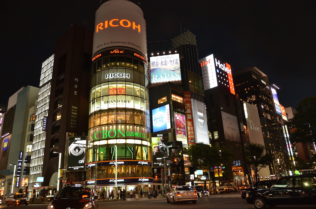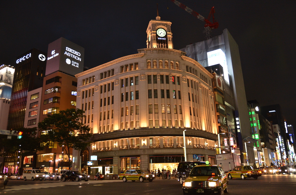 Llegamos ya de noche y lo primero con lo que nos encontramos fue con el edificio Wako  con su emblemático reloj, se encuentra en el cruce de Chuo con Harumi Dori.