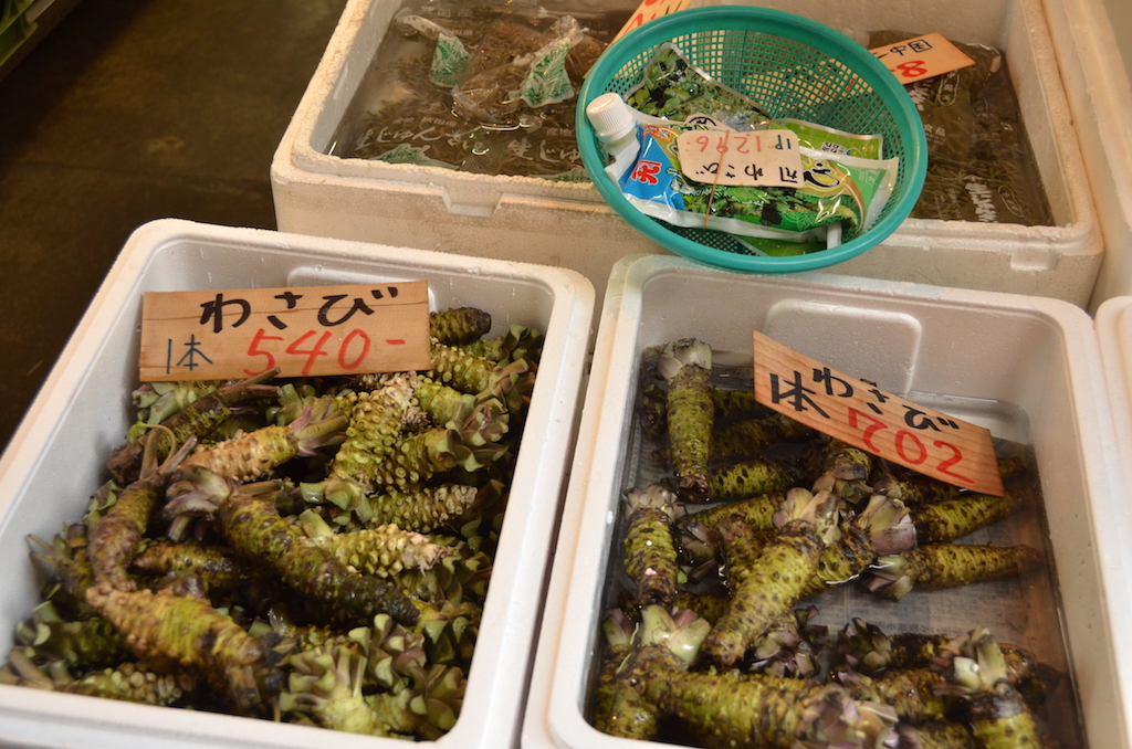 Vemos por primera vez la raiz de wasabi, la cual rayan para utilizarla en diferentes platos de la gastronomía japonesa, entre ellos en los platos de sushi. El wasabi que comimos en Japón no tiene nada que ver con el que habíamos comido antes aquí, el japonés es únicamente el producto rayado y aquí lo encontramos como una pasta que seguro que lleva alguna cosa más.