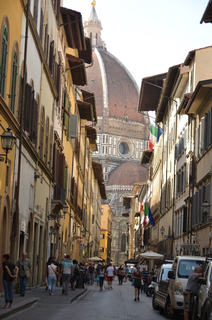 Salimos de la plaza por la calle que desemboca en la Piazza del Duomo, desde la que se obtienen unas bonitas vistas de la Cúpula de Brunelleschi.