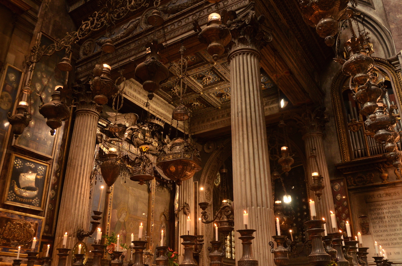Su interior es bastante recargado, nada más entrar a la derecha se encuentra el famoso fresco.