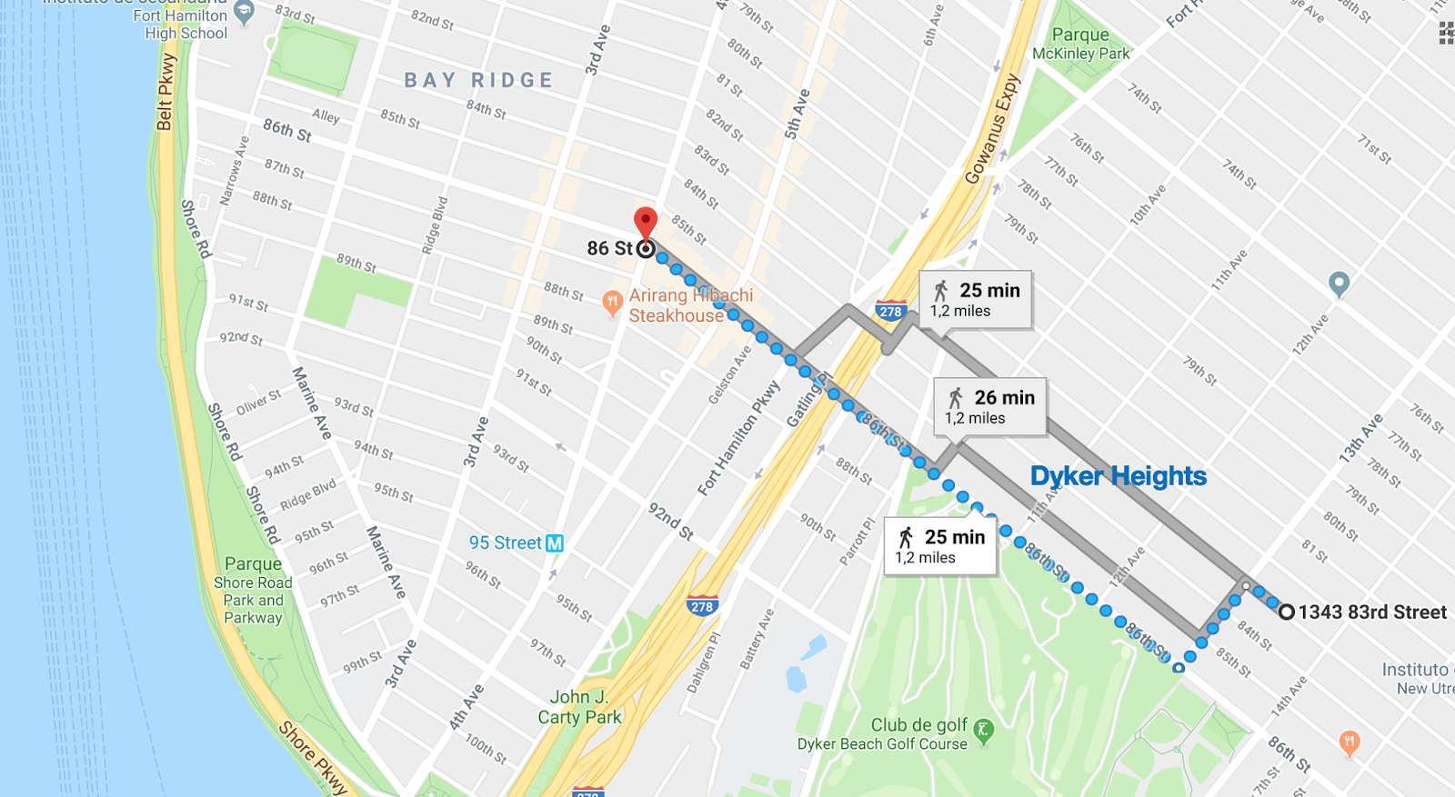 En la estación de metro Clark St fuimos hasta Borough Hall (ambas de la linea roja 2 y 3), allí hicimos un cambio a la estación de Court St donde tomamos la línea R hasta la parada 86St. Una vez allí fuimos caminando por la 86th St hasta el barrio, las casas más espectaculares se encuentran entre la 82th St y la 86th St y entre la 11th Av y la 15th Av. OJO!! Es importante llegar caminando por la 86th St que es por donde se puede cruzar la autovía!!!!