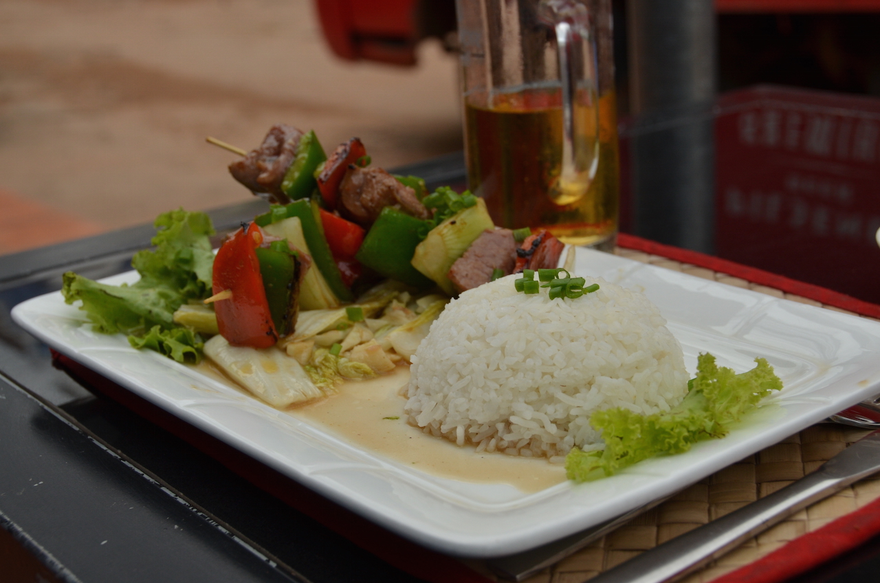 Pedimos dos platos y dos cervezas locales por 7$ todoooooo!! La comida estaba bastante buena.