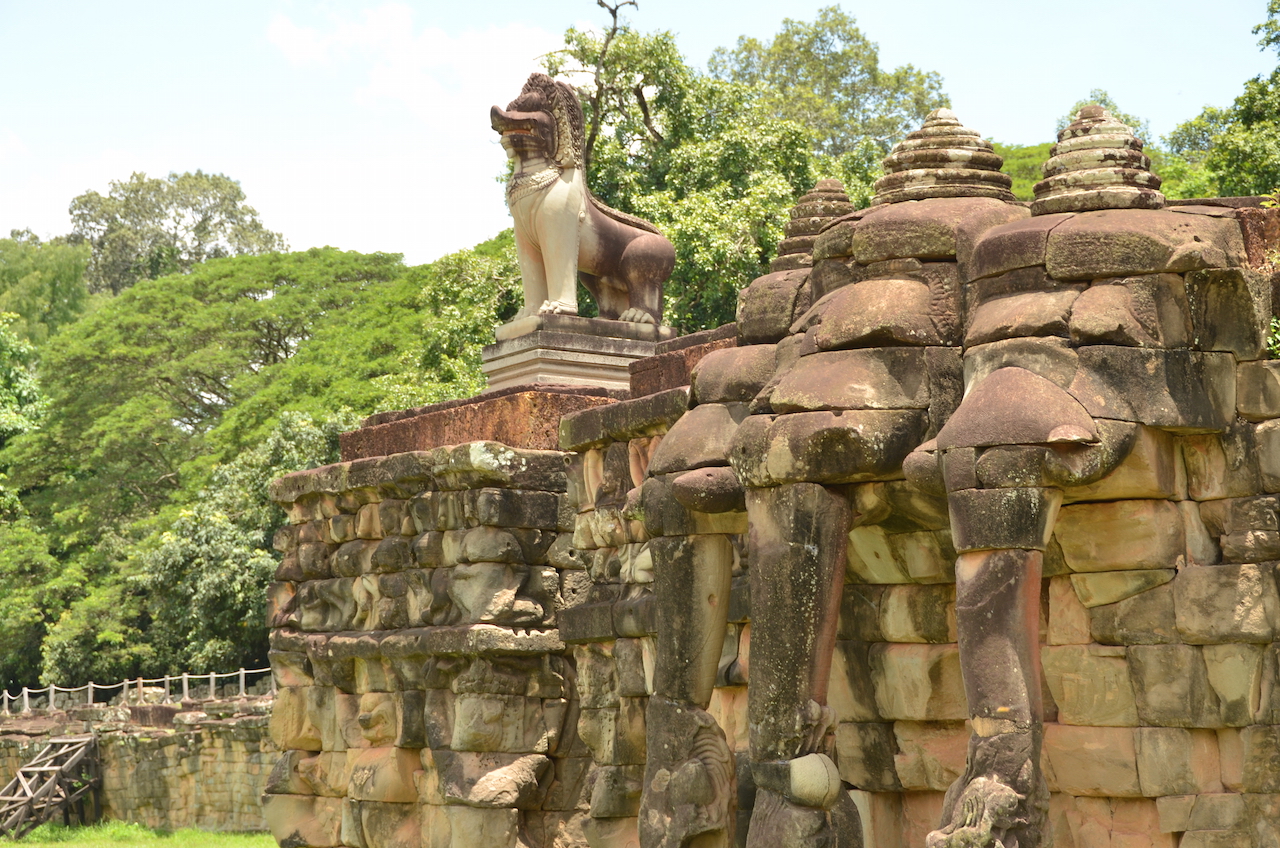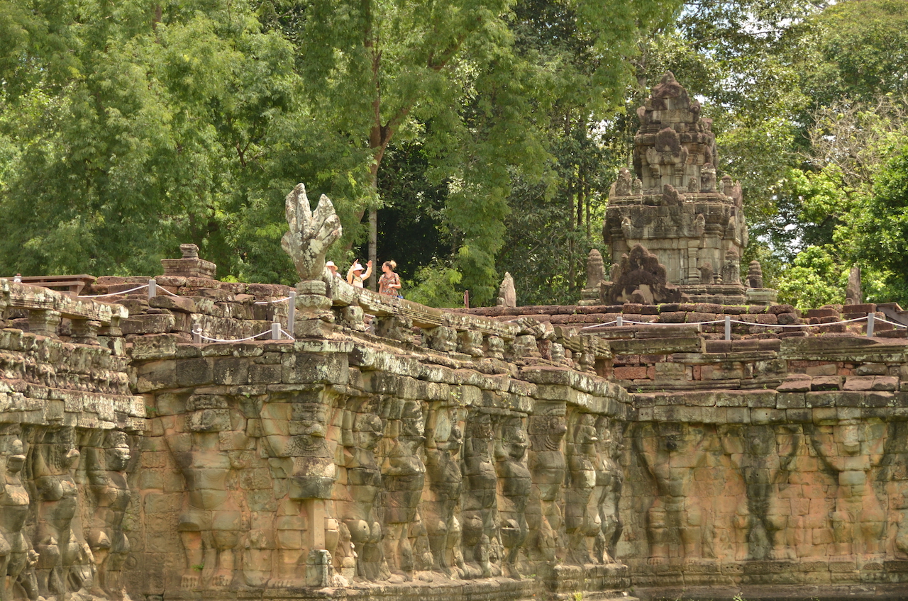 En el otro extremo se encuentra la Terraza de los Elefantes, lugar desde el que el monarca veía el desfile de las tropas militares. Se trata de uno de los elementos que nos deja claro la importancia del imperio jemer.