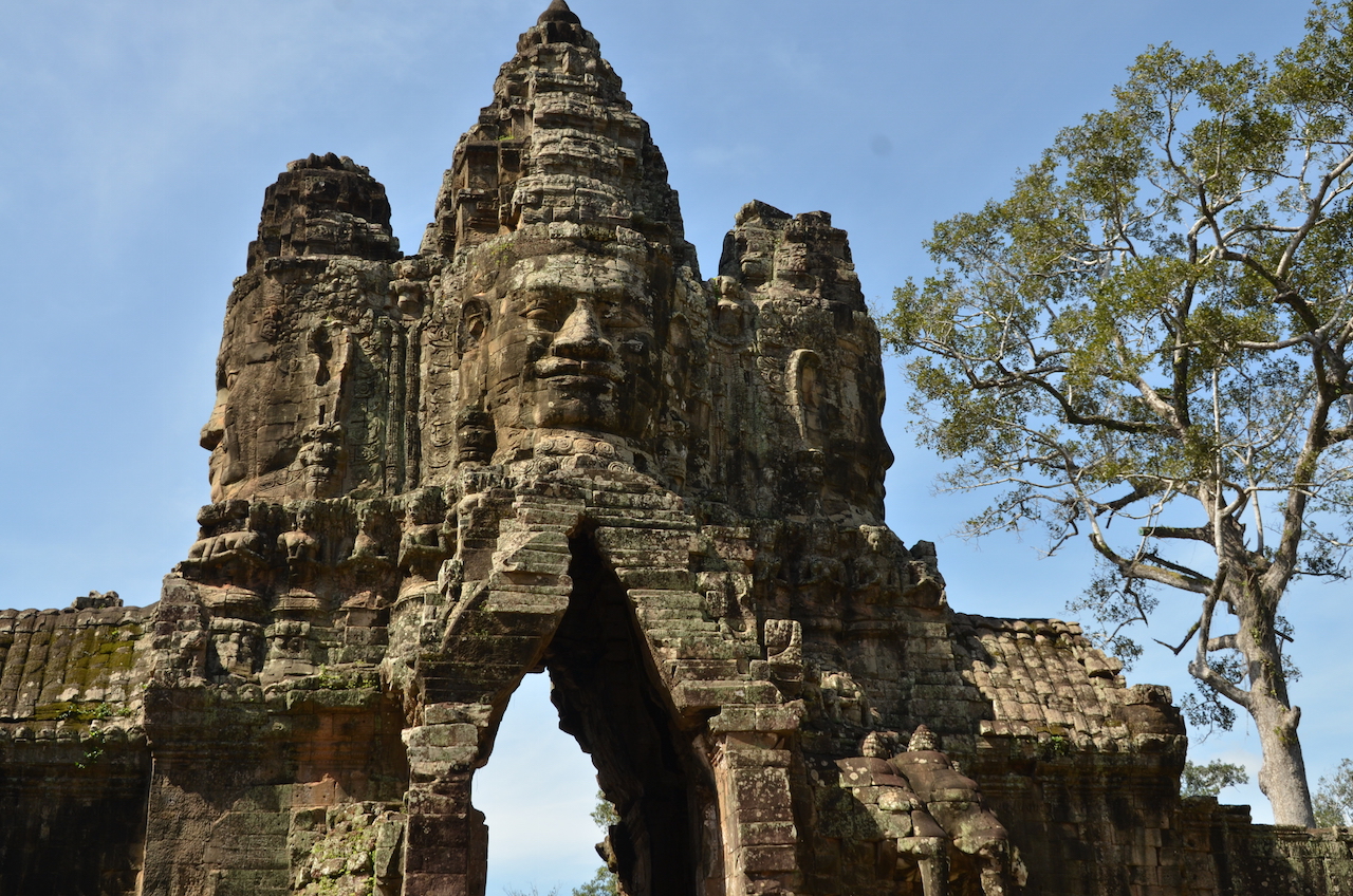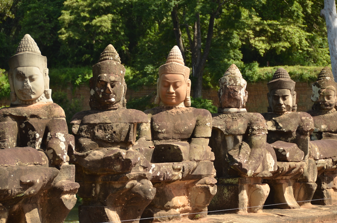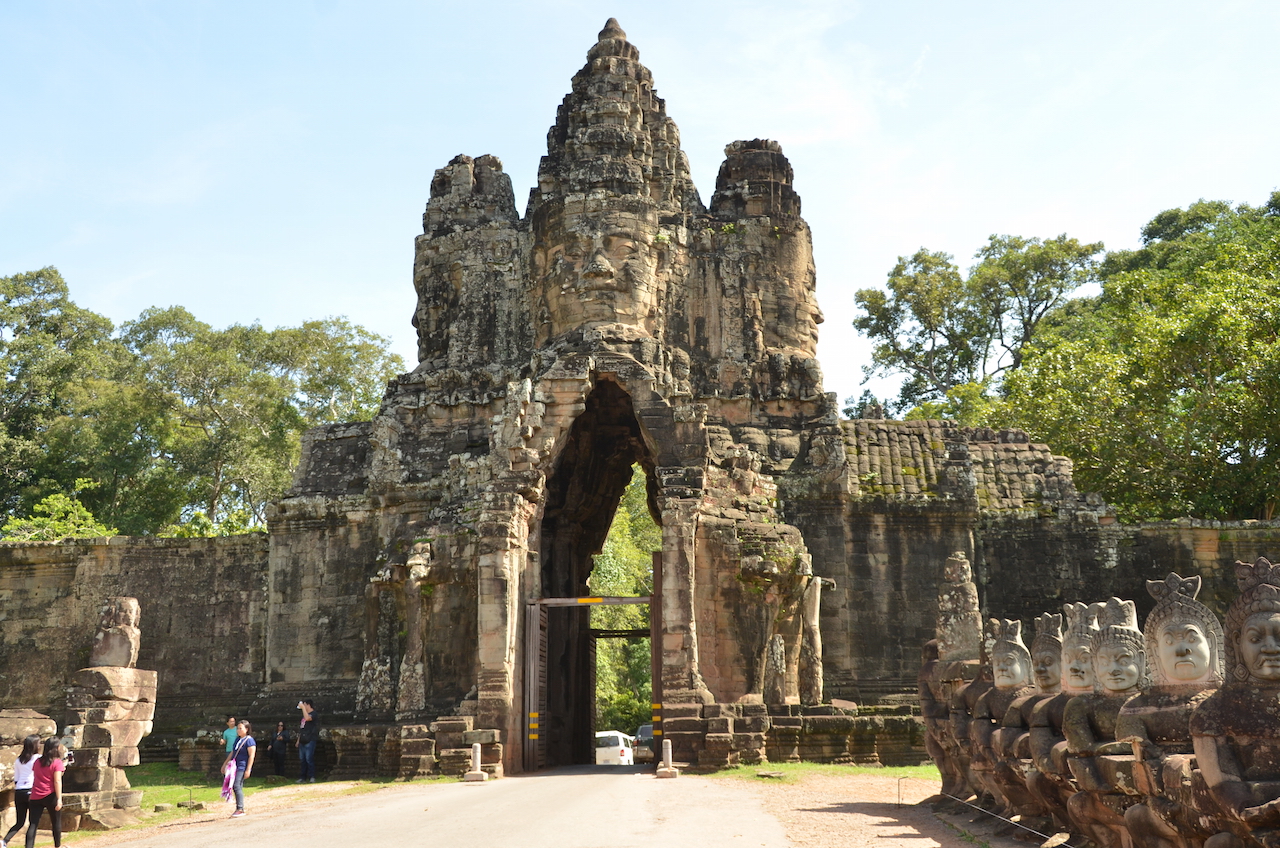 Antes de entrar en Angkor Thom, paramos en su Puerta sur, custodiada por dos hileras de 54 Devas (dioses) y 54 Asuras (demonios). Se trata de una puerta ornamental con una cara de Buda, este tipo de puertas recibe el nombre de Gopura.