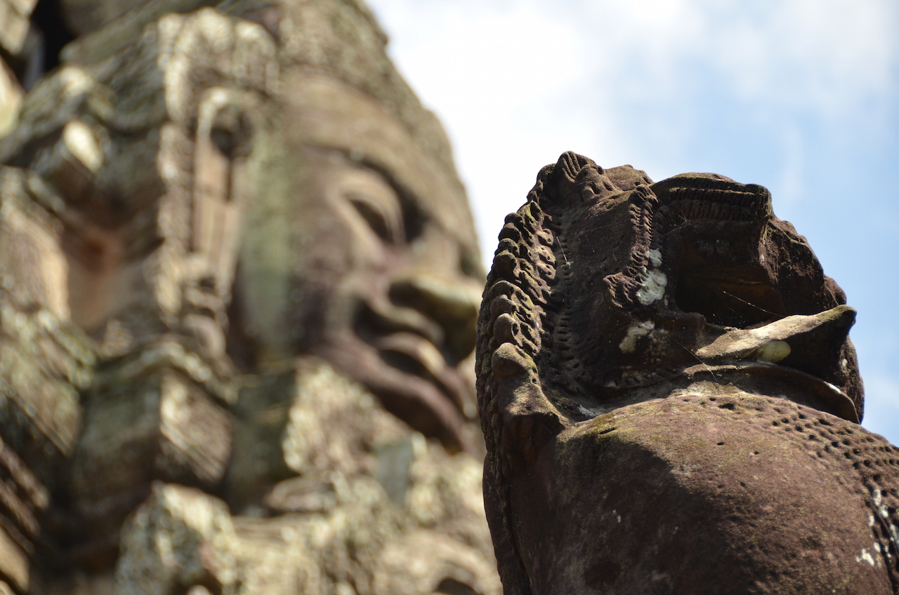 En Bayon encontramos un total de 54 torres en cada una de las cuales se muestran las famosas caras que apuntan hacia los cuatro puntos cardinales. Hay diferentes versiones de a quién corresponde el rostro que allí se representa, desde el dios hindú Brahma, hasta el propio rey Jayavarman VII. Hay más de 200 caras representadas en todo el templo!!!
