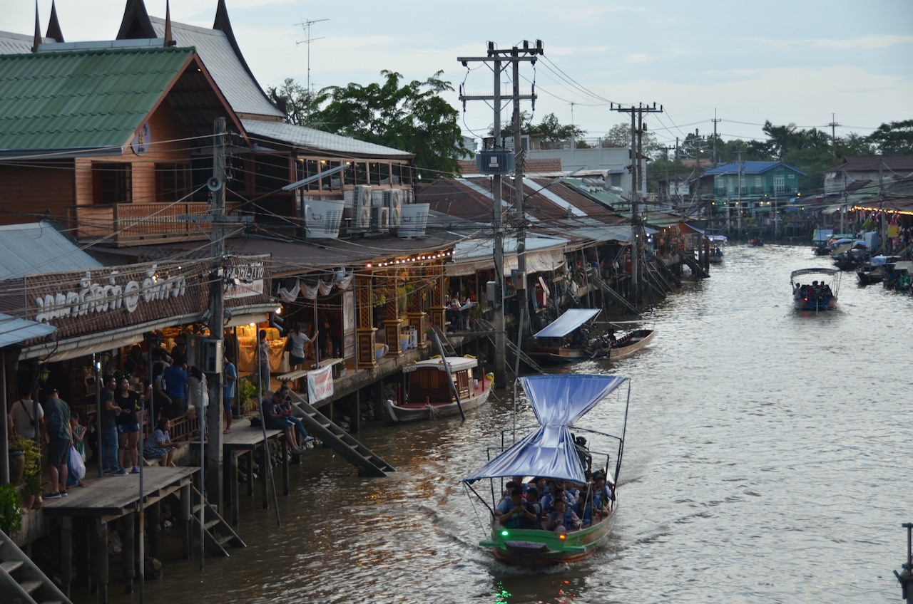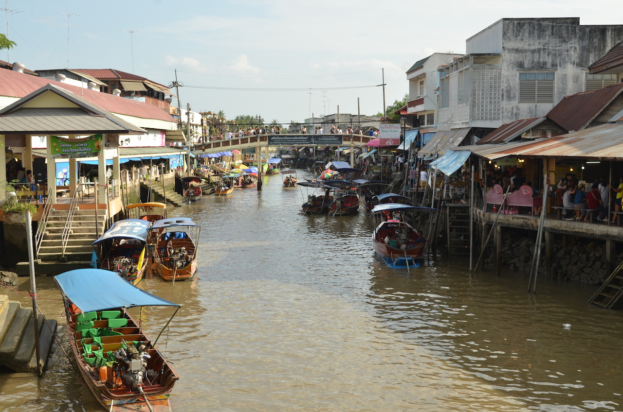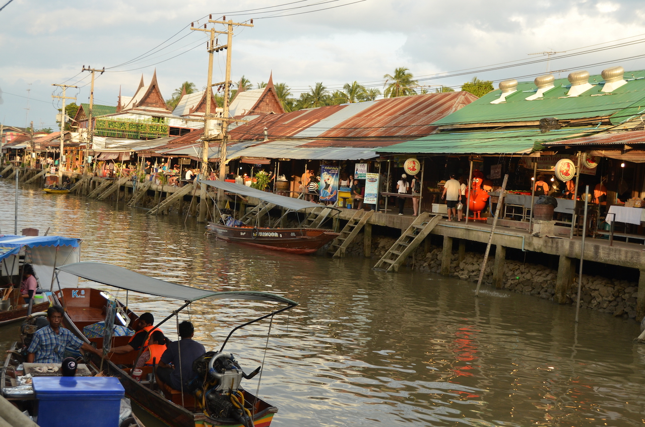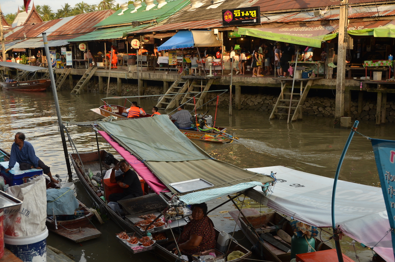 Cuando buscaba información para las visitas en los días que pasamos en Bangkok, tenía claro que quería visitar un mercado flotante, todo el mundo coincidía en que Damnoen Saduak, uno de los más conocidos, se había convertido en un lugar tan turístico que era complicado disfrutar de la visita, así que lo descartamos, pero encontré información sobre otro mercado flotante que, aunque también es bastante turístico, es un lugar al que acuden los locales a evadirse un poco de la gran ciudad y a disfrutar de la gran cantidad de gastronomía que ofrece, se trata del mercado de Amphawa, del que hablaré más adelante.