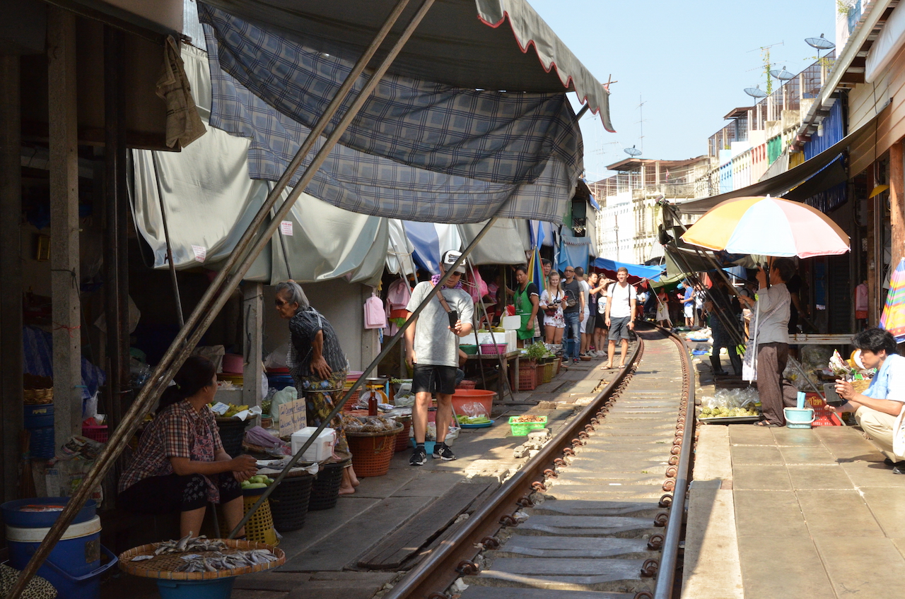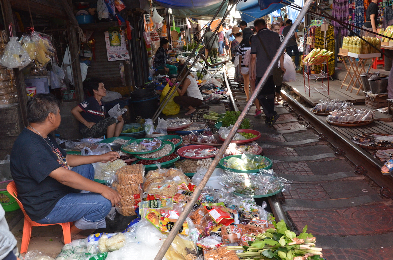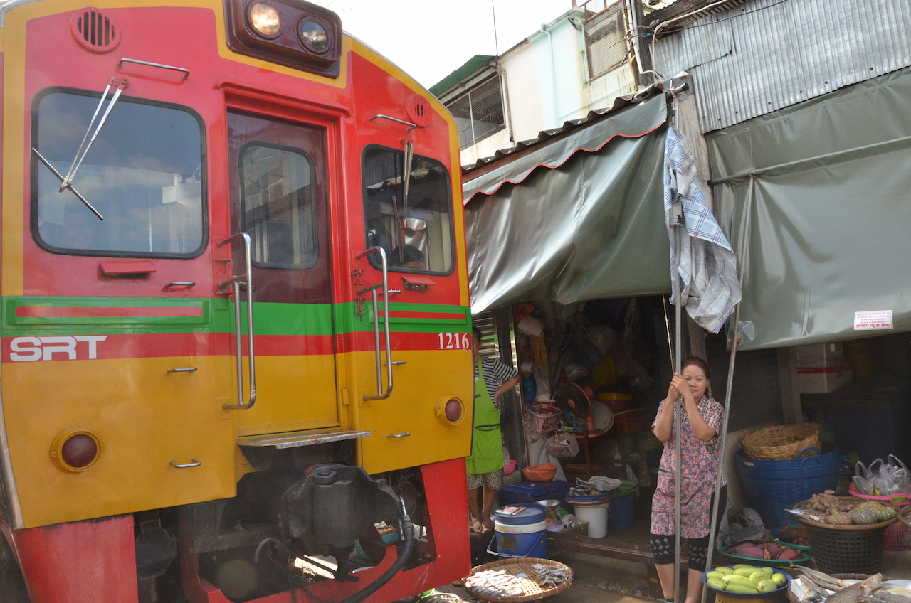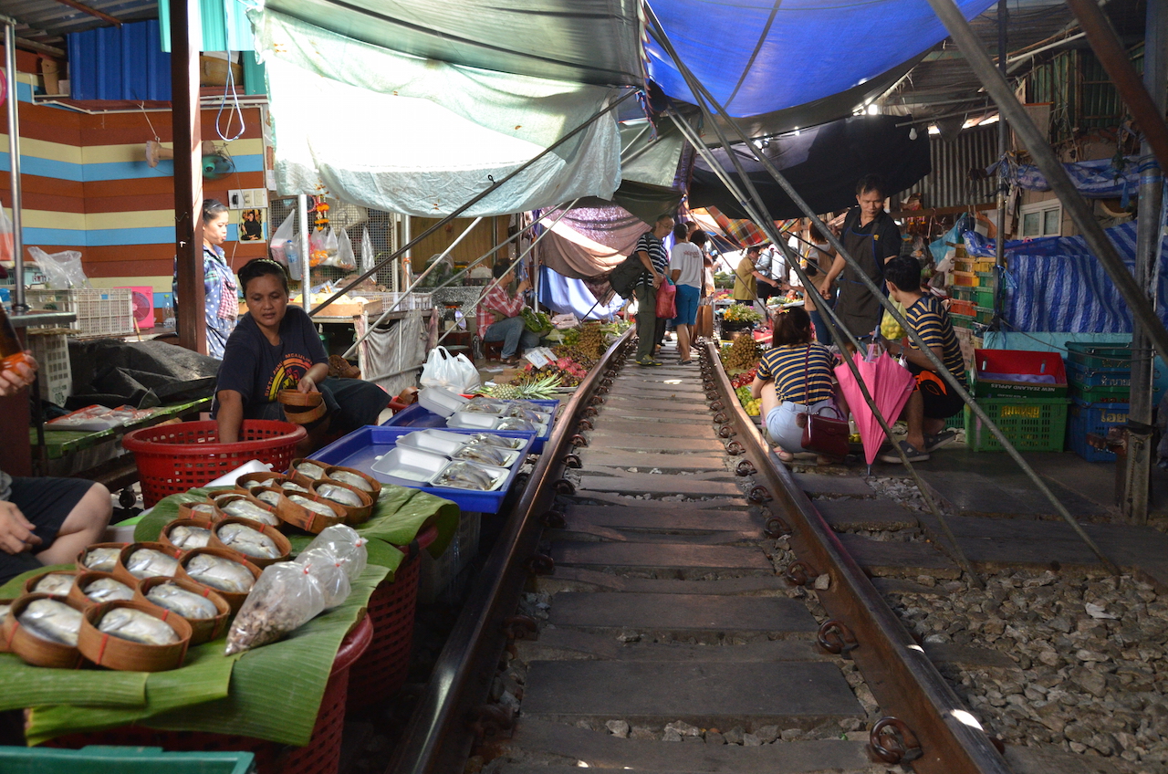 Los puestos se encuentran a ambos lados de las vías y cuando el tren pasa, lo hace varias veces al día, deben retirar los toldos y parte de la mercancía, en cuestión de segundos el mercado desaparece y vuelve a aparecer tras el paso del tren, esto es lo que hace que Mae Klong sea uno de los mercados más especiales del mundo.