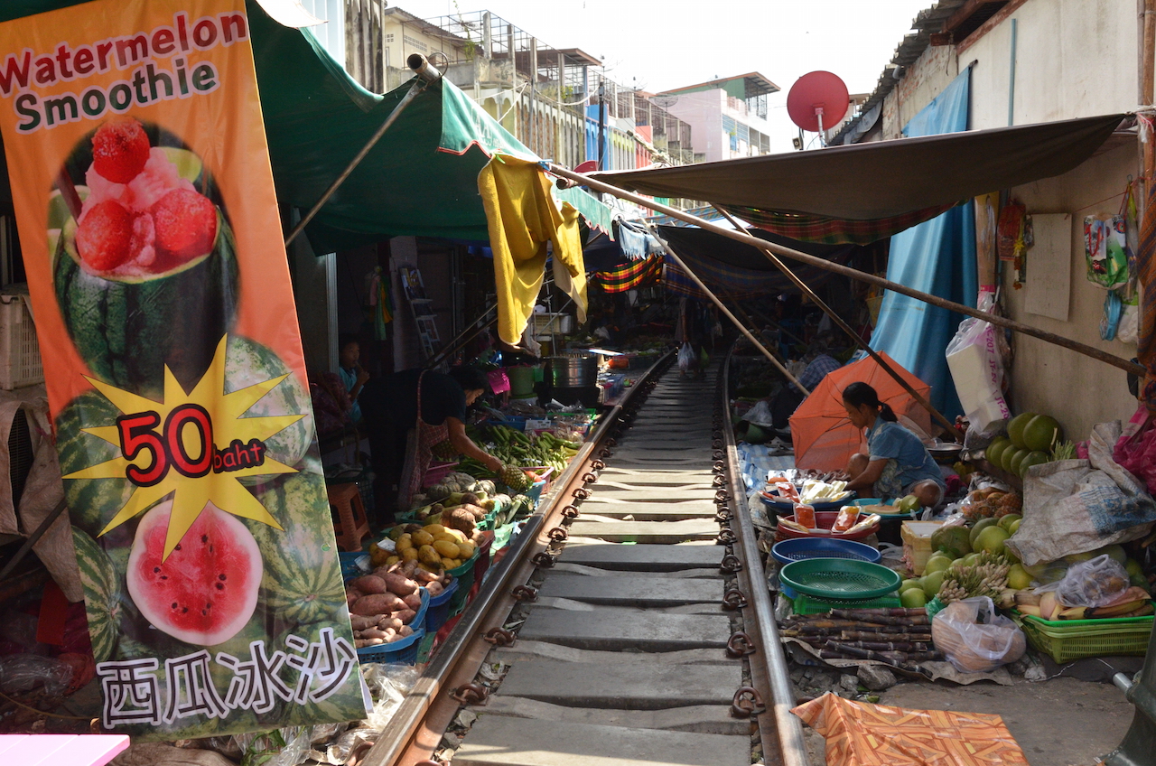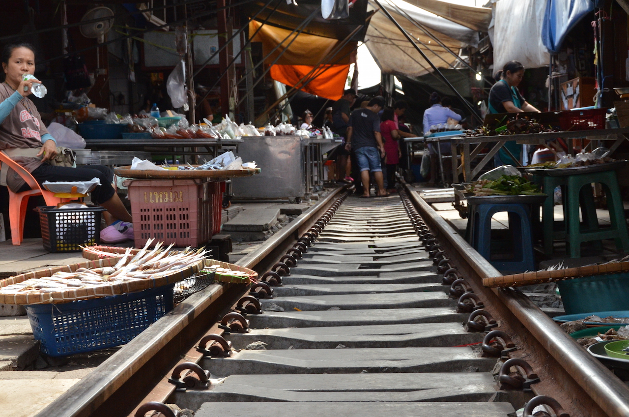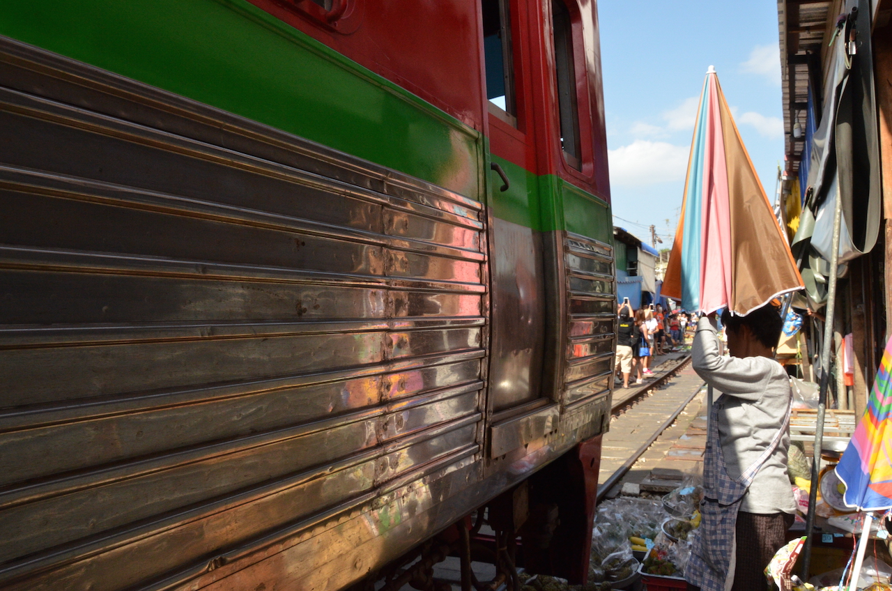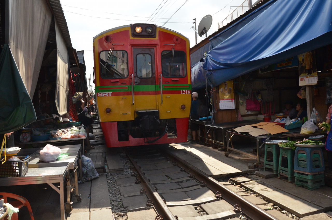 Los puestos se encuentran a ambos lados de las vías y cuando el tren pasa, lo hace varias veces al día, deben retirar los toldos y parte de la mercancía, en cuestión de segundos el mercado desaparece y vuelve a aparecer tras el paso del tren, esto es lo que hace que Mae Klong sea uno de los mercados más especiales del mundo.