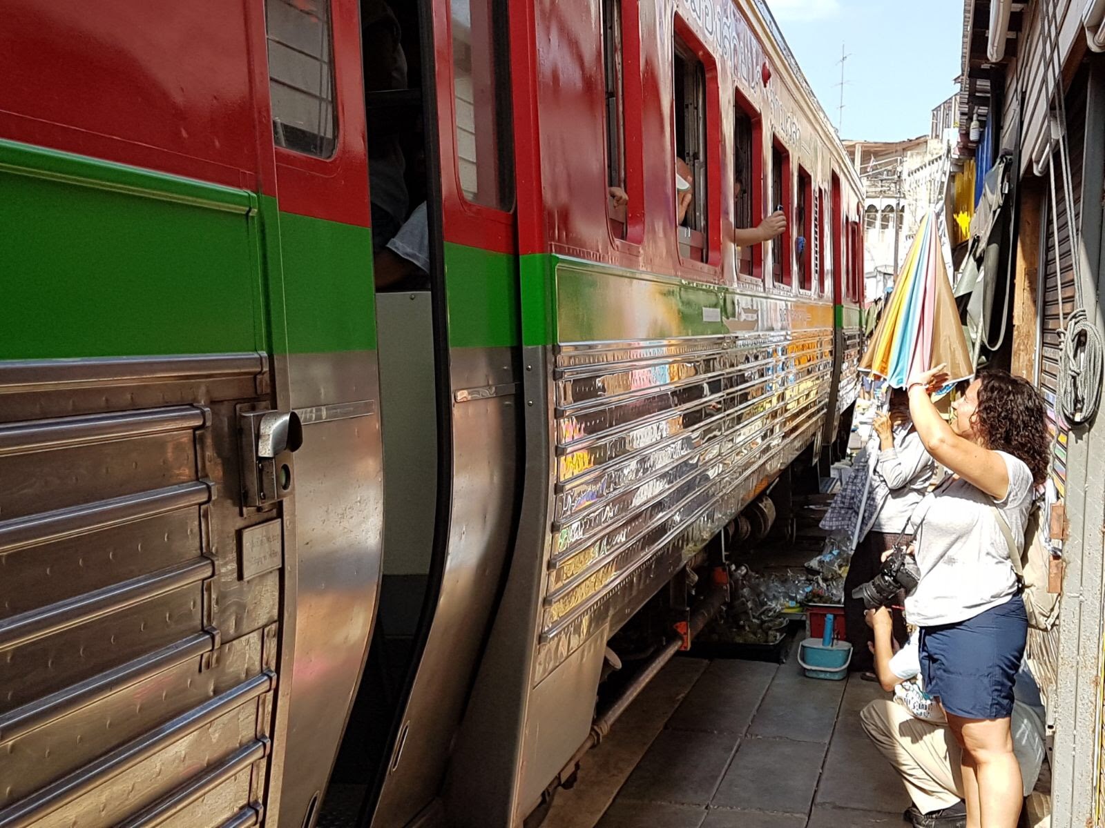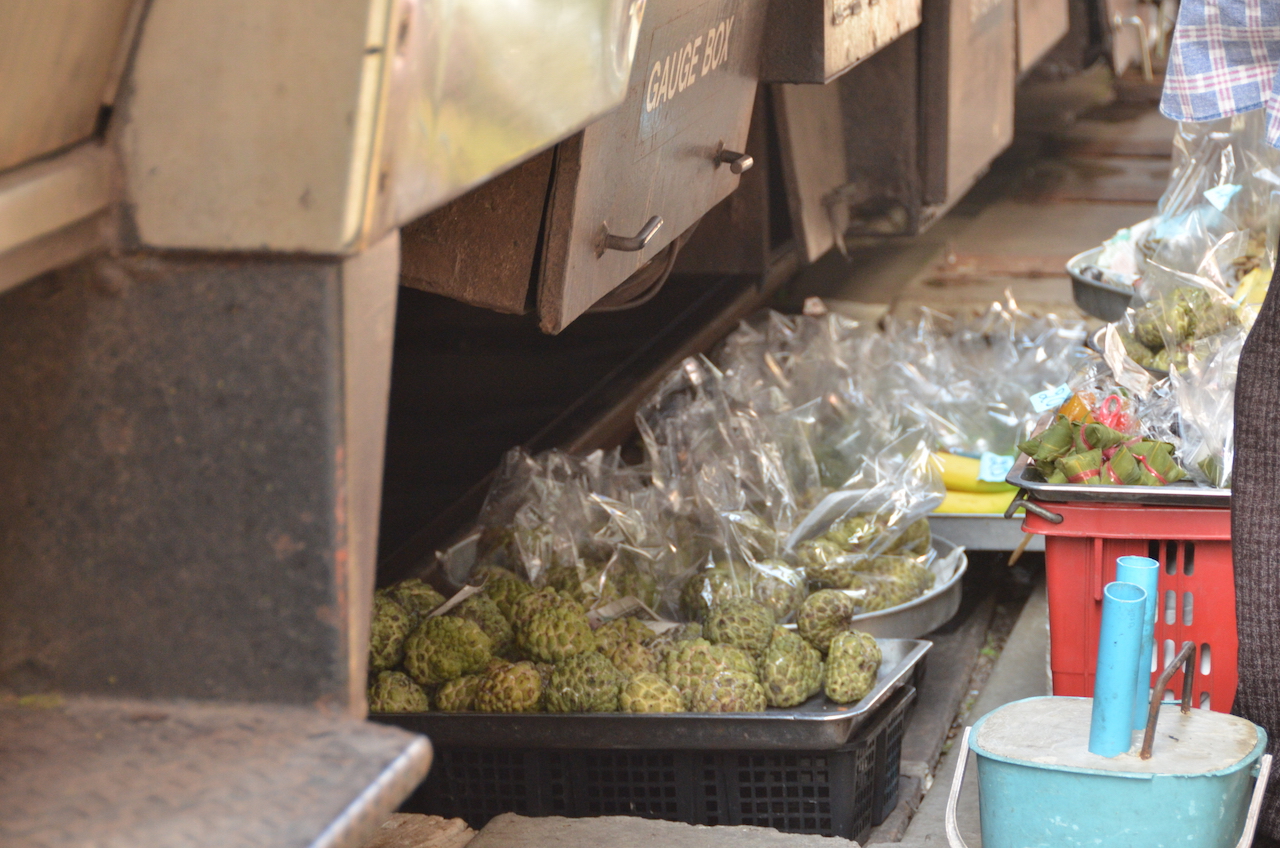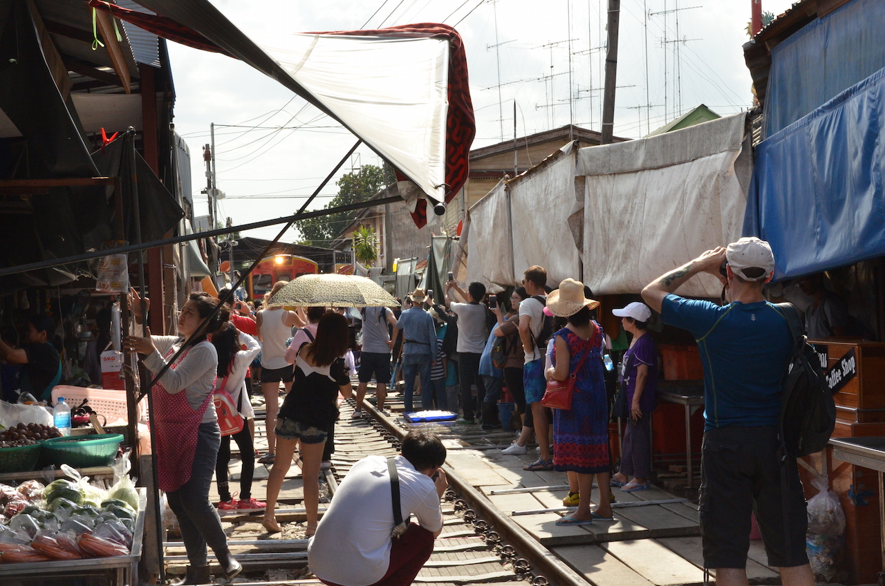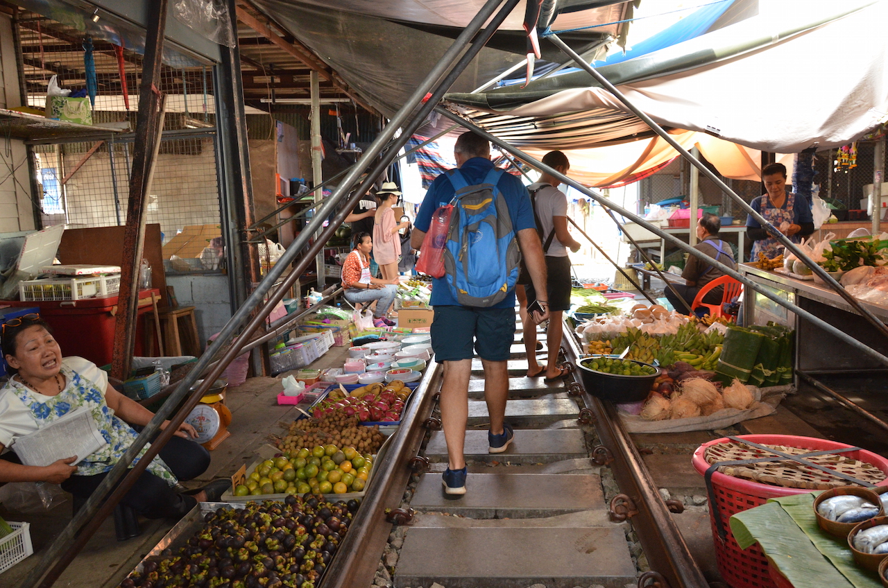 Los puestos se encuentran a ambos lados de las vías y cuando el tren pasa, lo hace varias veces al día, deben retirar los toldos y parte de la mercancía, en cuestión de segundos el mercado desaparece y vuelve a aparecer tras el paso del tren, esto es lo que hace que Mae Klong sea uno de los mercados más especiales del mundo.