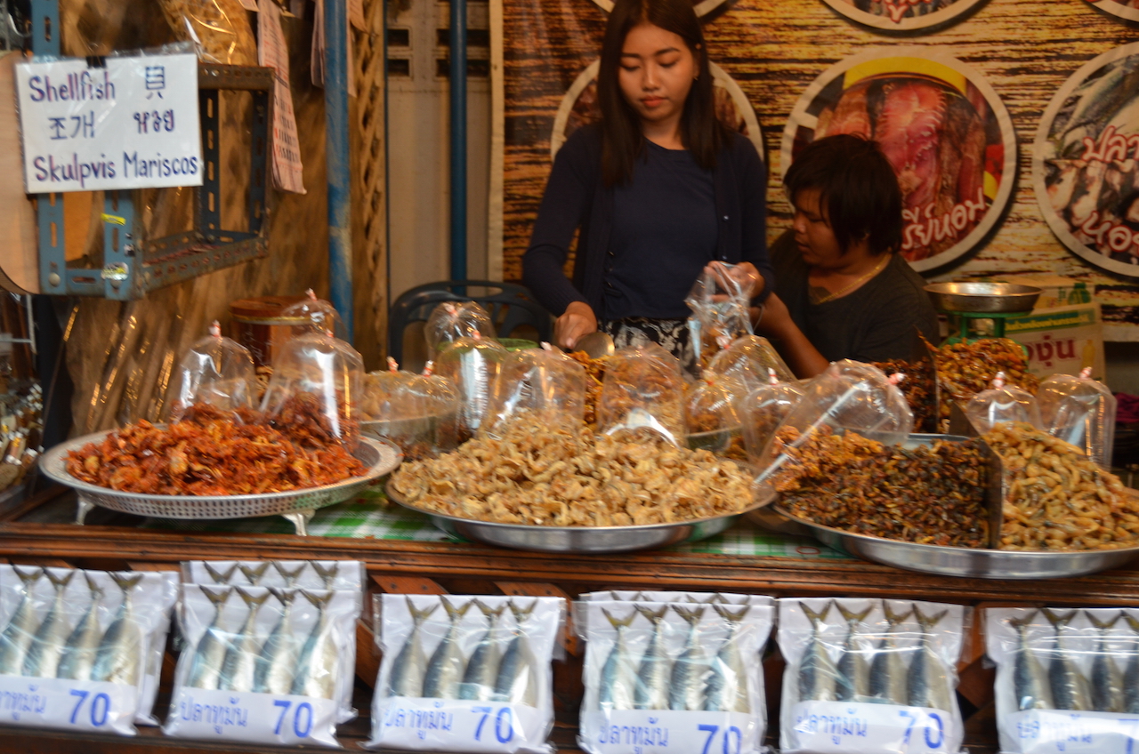 Para picar durante la excursión compramos unos chips de Taro por 40 THB. En este mercado se pueden encontrar muchos productos que no habíamos visto nunca, algunos bastante raros y otros nada apetecibles para nosotros jejeje. Había muchos puestos de pescado y marisco que para nuestros estándares, no cumplían las mejores condiciones de higiene, pero todo es acostumbrarse.