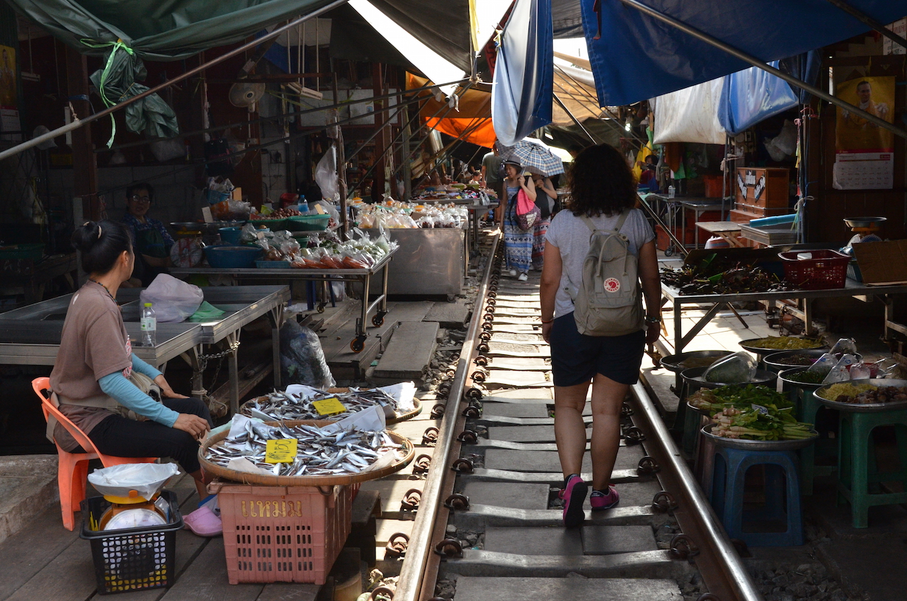 Si hay algo que nos gusta visitar en nuestros viajes, son los mercados de las ciudades, el allí donde se ve realmente cómo viven sus habitantes, lo que comen, te muestran parte de su cultura y tienes ante ti todo un escaparate de productos típicos del lugar. En Tailandia no iba a ser menos y a lo largo de nuestro viaje visitamos bastantes mercados, pero hay uno que desde luego que merece una mención especial porque no creo que visitemos otro tan «raro» nunca, se trata del mercado de Mae Klong, el famoso mercado sobre las vías de tren.