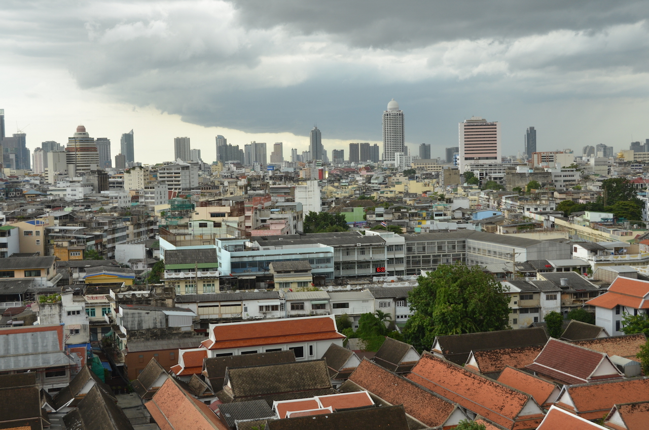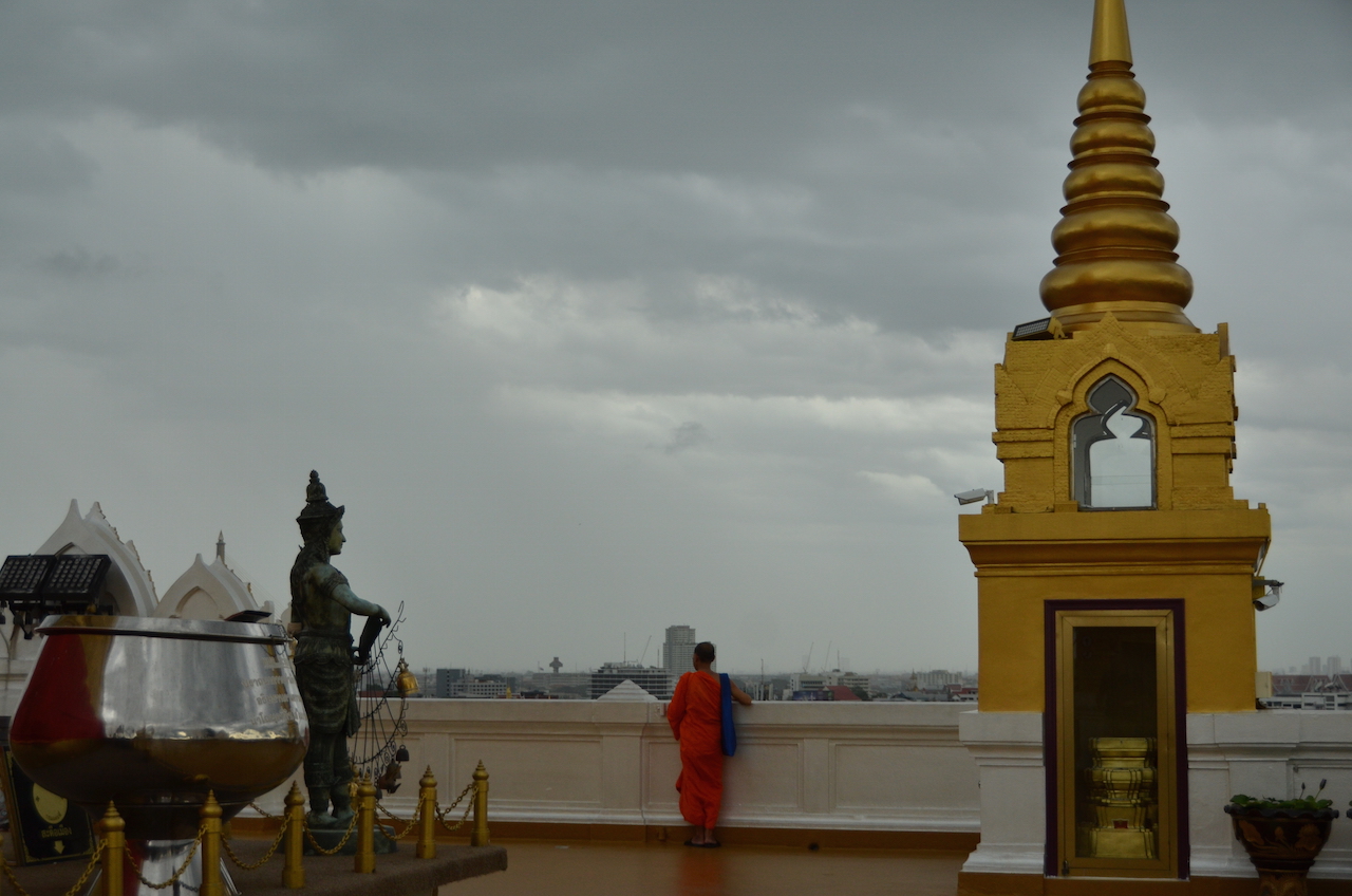 Antes de que cayese el diluvio universal subimos por unas escaleras laterales a la terraza descubierta a ver el gran Chedi Dorado donde se guarda una reliquia de Buda. Desde allí hay unas vistas de 360º de la ciudad de Bangkok y todos queríamos disfrutarlas!!