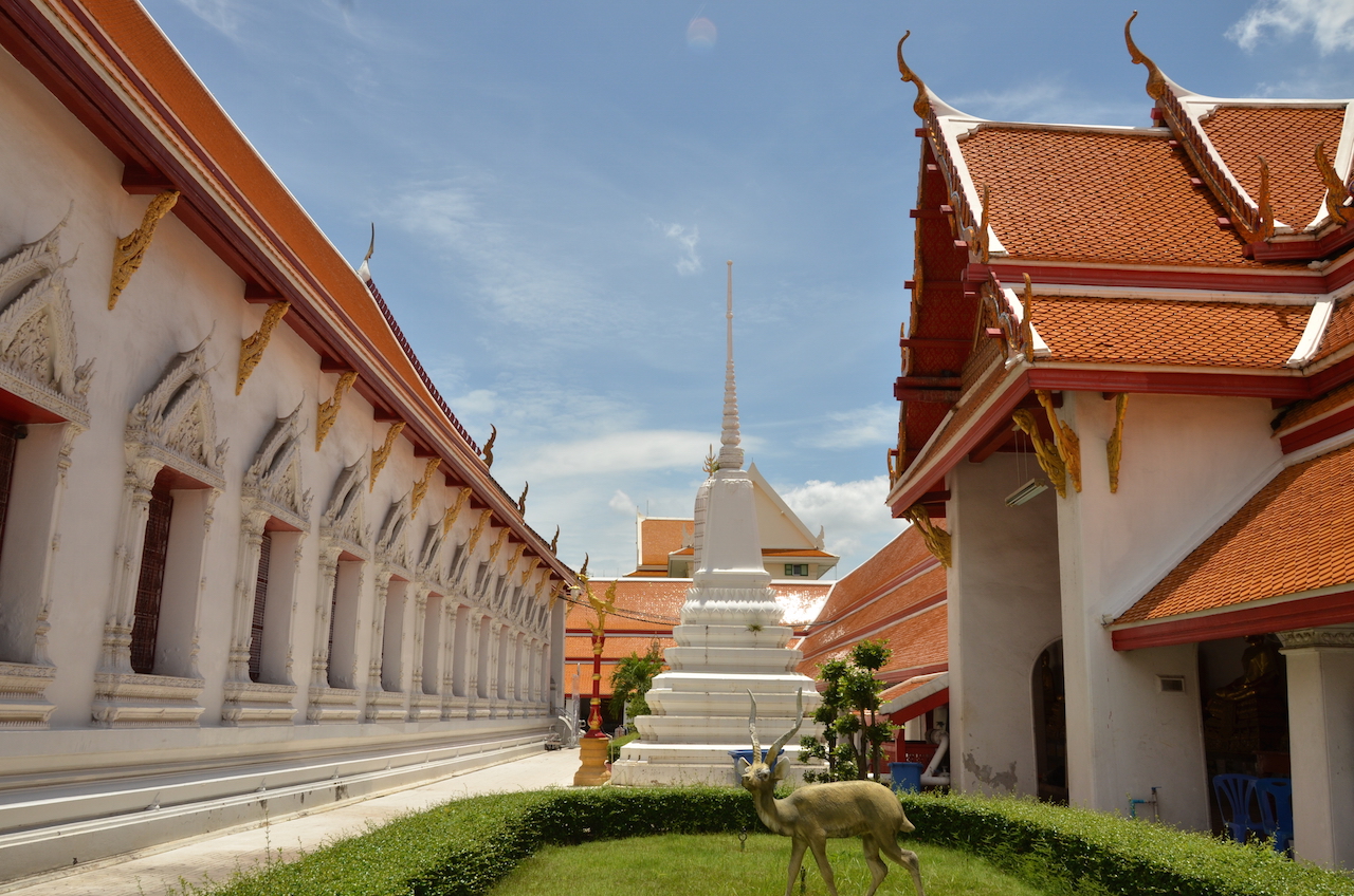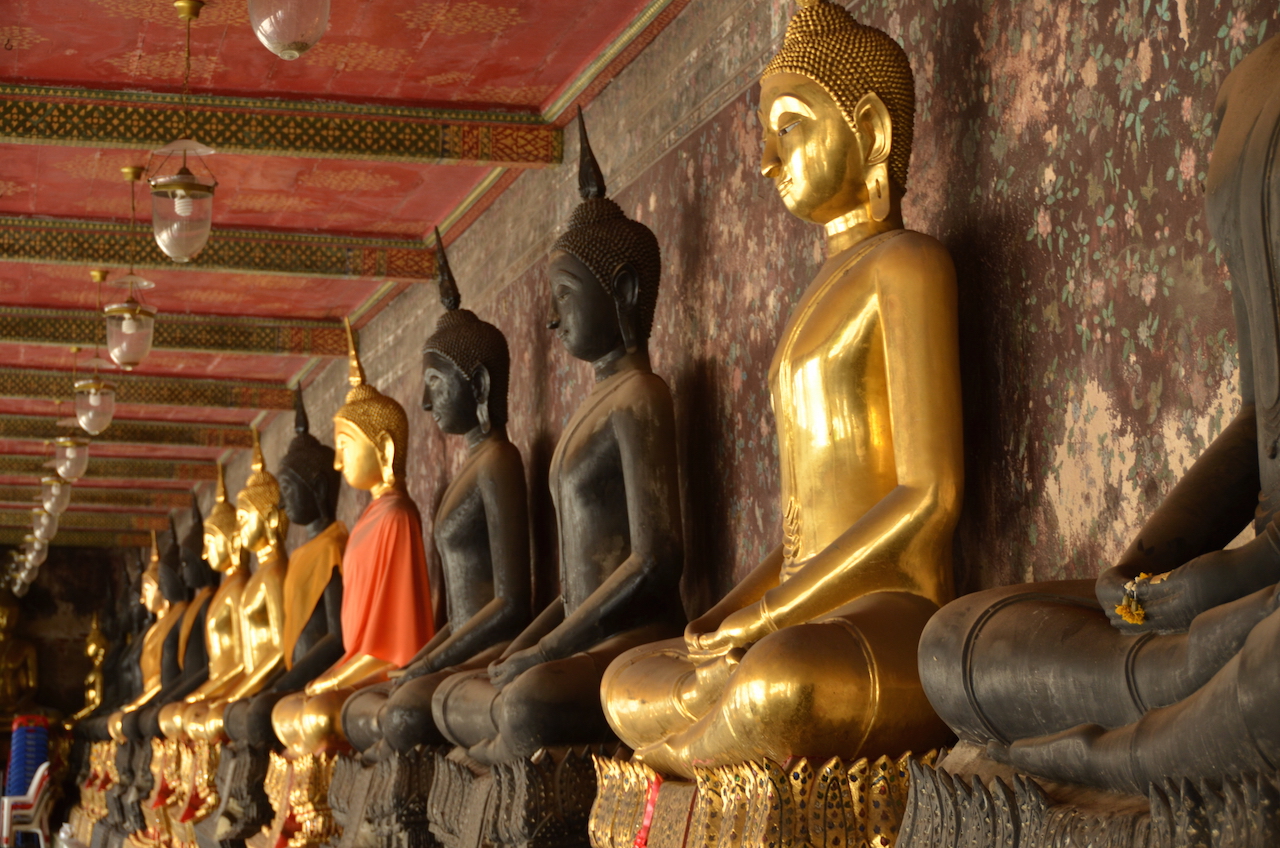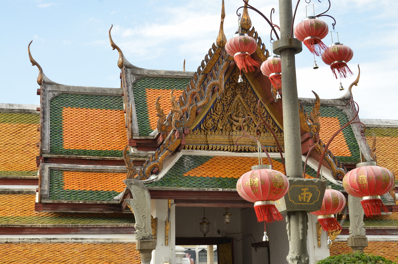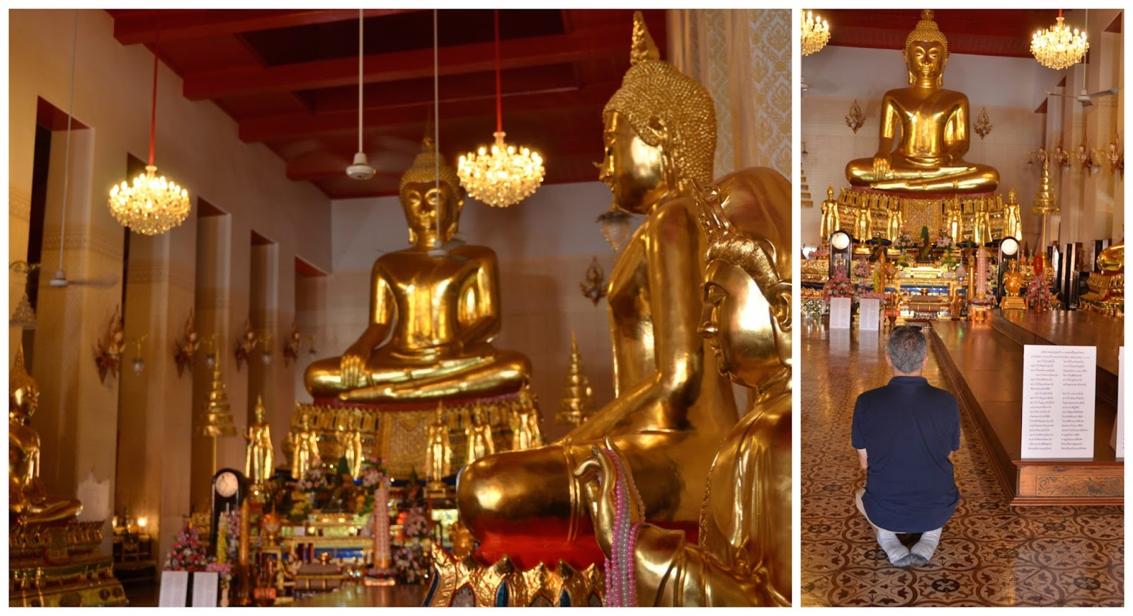 Caminando por una calle en la que hay muchos negocios de venta de imágenes religiosas, llegamos al Wat Suthat y pagamos de entra 20 THB por persona, el templo se encuentra en pleno proceso de restauración, el edificio principal se encuentra cubierto de andamios, pero aún así merece la pena visitarlo ya que se puede pasar a ver el Gran Buda que alberga.