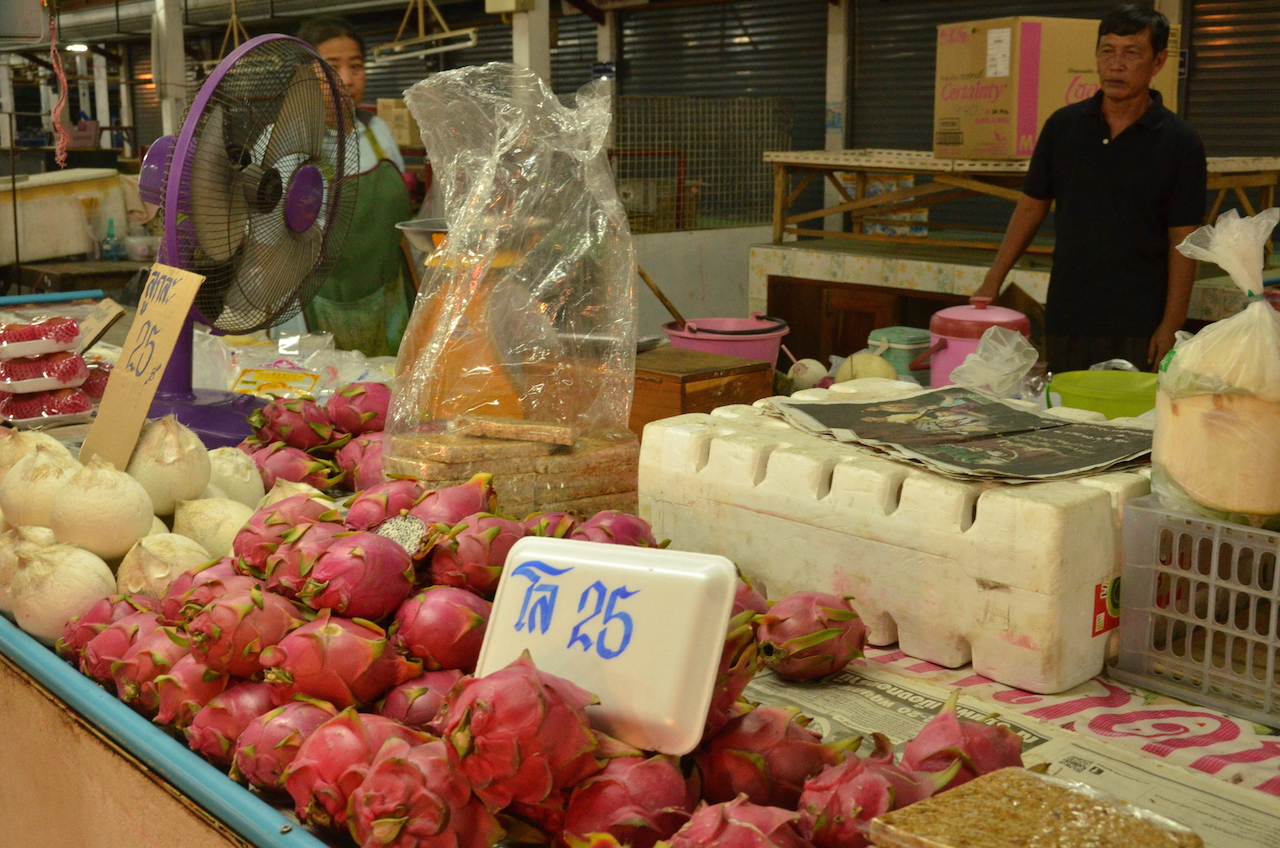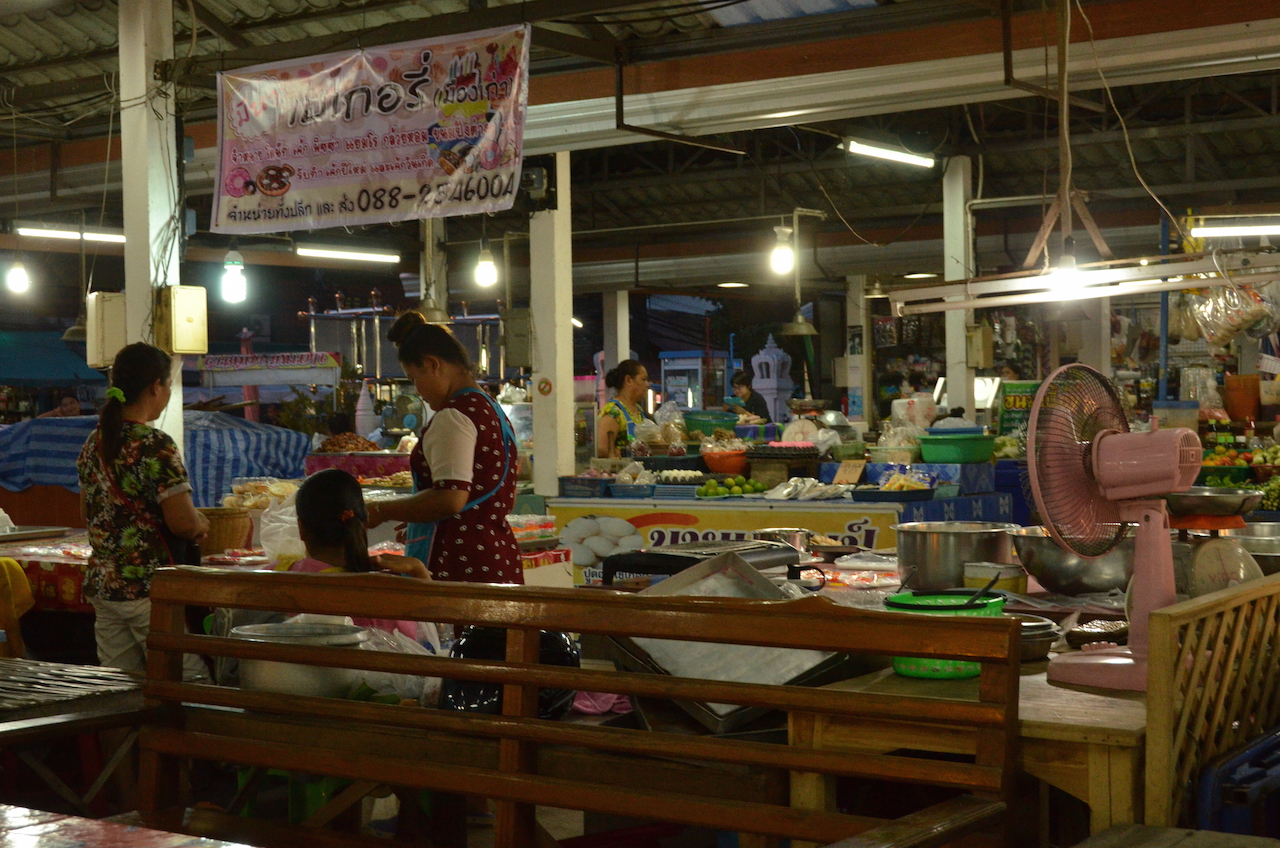 Antes de ir a cenar nos fuimos al mercado de productos frescos que se encuentra en la calle principal, junto al templo Wat Tra Phang Thong Lang. En todos nuestros viajes nos gusta visitar este tipo de mercados y ver qué productos se consumen en cada lugar.