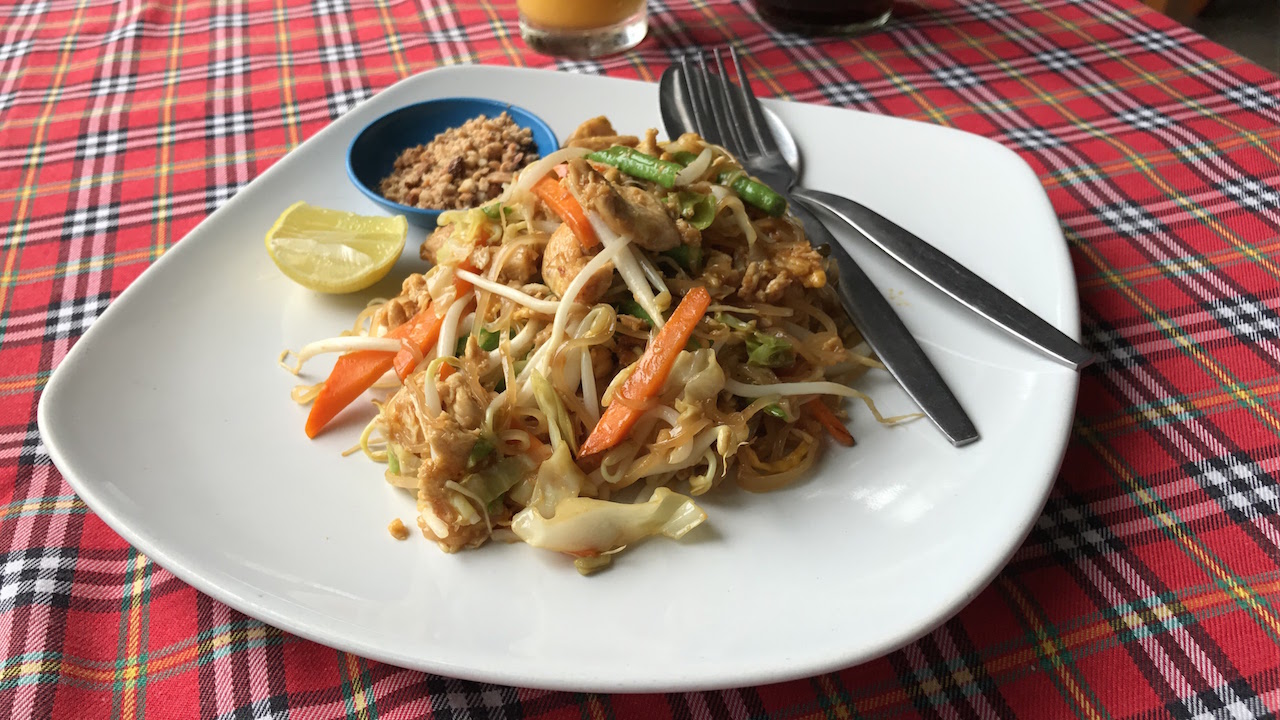Paramos a comer en la carretera principal en uno de los muchos restaurante s que te encuentras en esta zona. Elegimos dos platos de Pad Thai estilo Sukhothai que estaban muy buenos. El nombre del restaurante es el que aparece en el cartel a la entrada jejeje, totalmente recomendable.