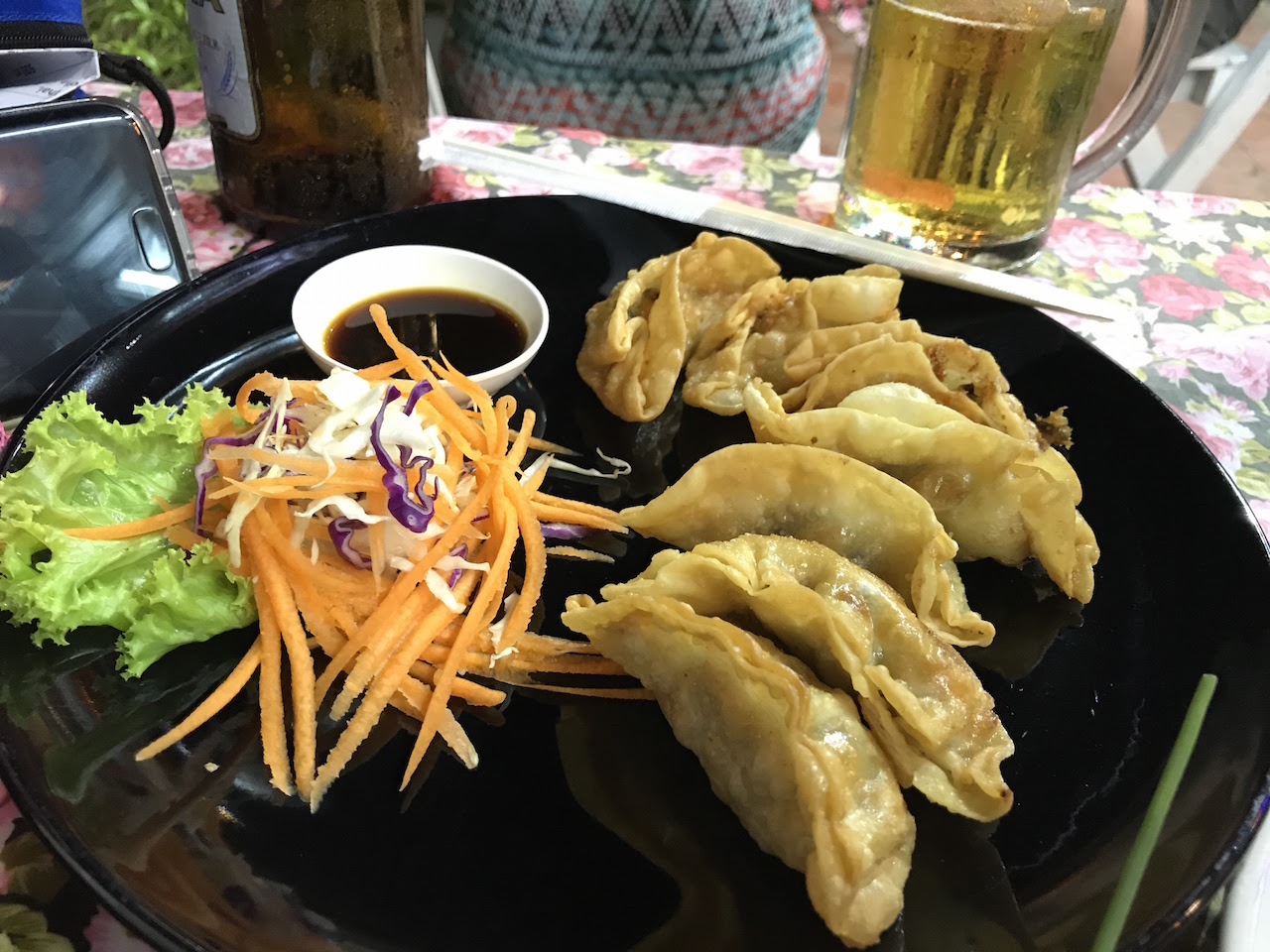Pedimos dos cervezas, unos wat ton vegetales, unas brochetas de pollo y pad thai de gambas en tortilla, además de un postre de plátano frito, todo por 450 THB!!! La comida estaba buenísima!!!