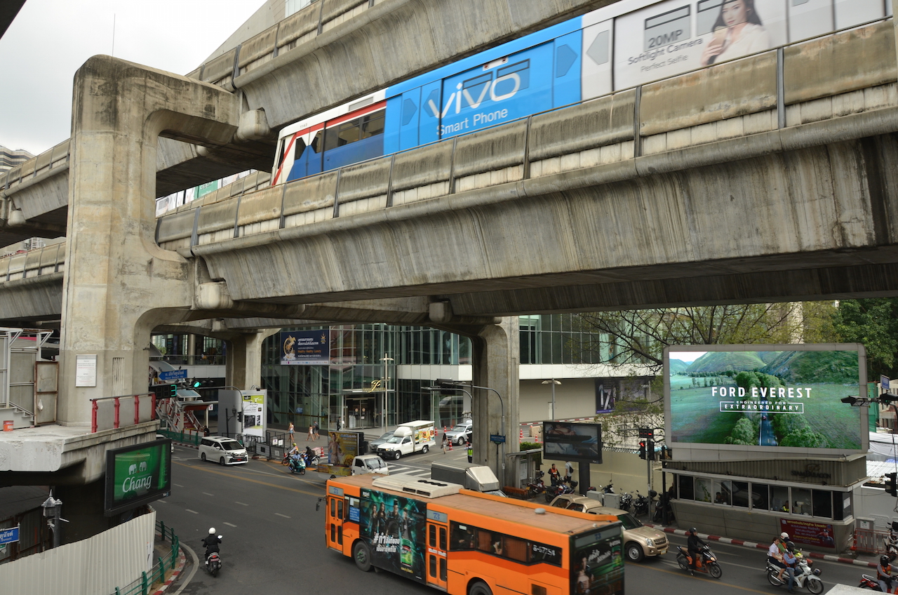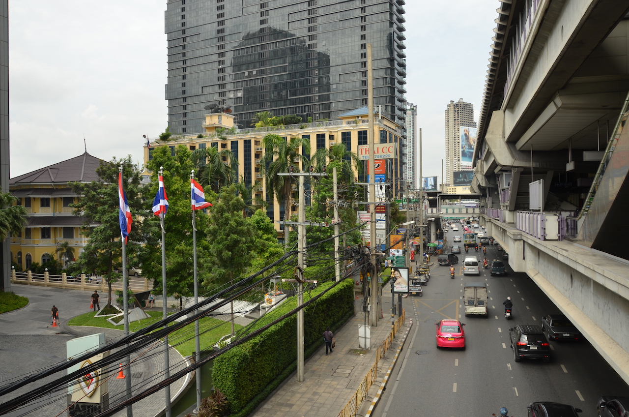Volvimos al skytren desde nuestro propio hotel para dirigirnos hasta la parada Ratchadamri, desde donde caminando unos minutos llegamos hasta el Santuario Erawan.