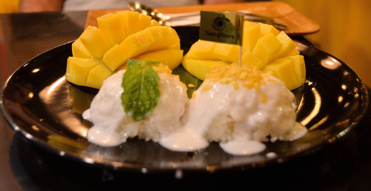 Después de esta visita nos vamos a uno de los centros comerciales y buscamos un lugar para comer uno de nuestros platos preferidos en Tailandia, el mango sticky rice.