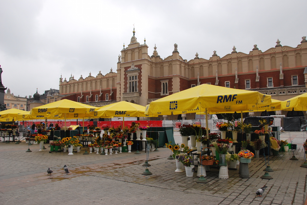 Desde cualquier punto de la plaza puede verse el enorme edificio Sukiennice (la Lonja de los Paños), cuya edificación principal data de 1319 cuando era un edificio gótico de ladrillo que posteriormente se reformó en estilo renacentista y al que en el siglo XIX se le añadieron los pórticos neogóticos, las pequeñas torres y las portadas centrales. En su interior hay numerosos puestos de artesanía y de productos locales y de otras ciudades polacas, sobre todo puestos de venta de ámbar, algo más típico del norte del país y que veríamos en los siguientes días.