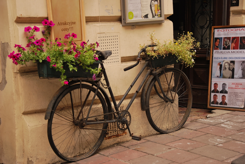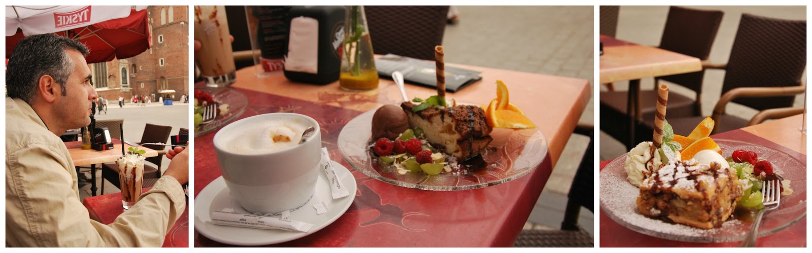 Volvemos a Rynek Glowny disfrutando de encantadores rincones y nos sentamos en una terraza a tomar un café con una porción de tarta.